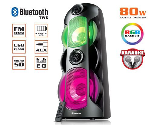 Мультимедійна портативна акустична система REAL-EL X-787 має сучасний дизайн з RGB підсвічуванням і якісним потужним 80-ти Ватт-ним звучанням. Широкий функціонал "бумбокса" дозволяє прослуховувати музику підключаючи мобільні пристрої, ПК, TV, ноутбуки і т. д., як через вивід AUX, так і по Bluetooth. USB і Micro SD card роз'єми дають можливість прослуховувати аудіо-файли з flash носіїв. REAL-EL X-787 відмінний супутник для відпочинку на відкритій місцевості, два потужних літій-іонних акумулятора на 4400 мАг забезпечать Вас музикою на вельми тривалий час. Функція KARAOKE приємно здивує любителів співу, адже дана модель має можливість підключення відразу двох мікрофонів з регулюванням ехо.
