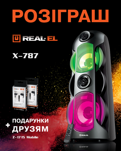 Участвуй в розыгрыше от REAL-EL и выигрывай портативную акустическую систему REAL-EL X-787 для себя и ДВЕ! гарнитуры REAL-EL Z-1715 для друзей!