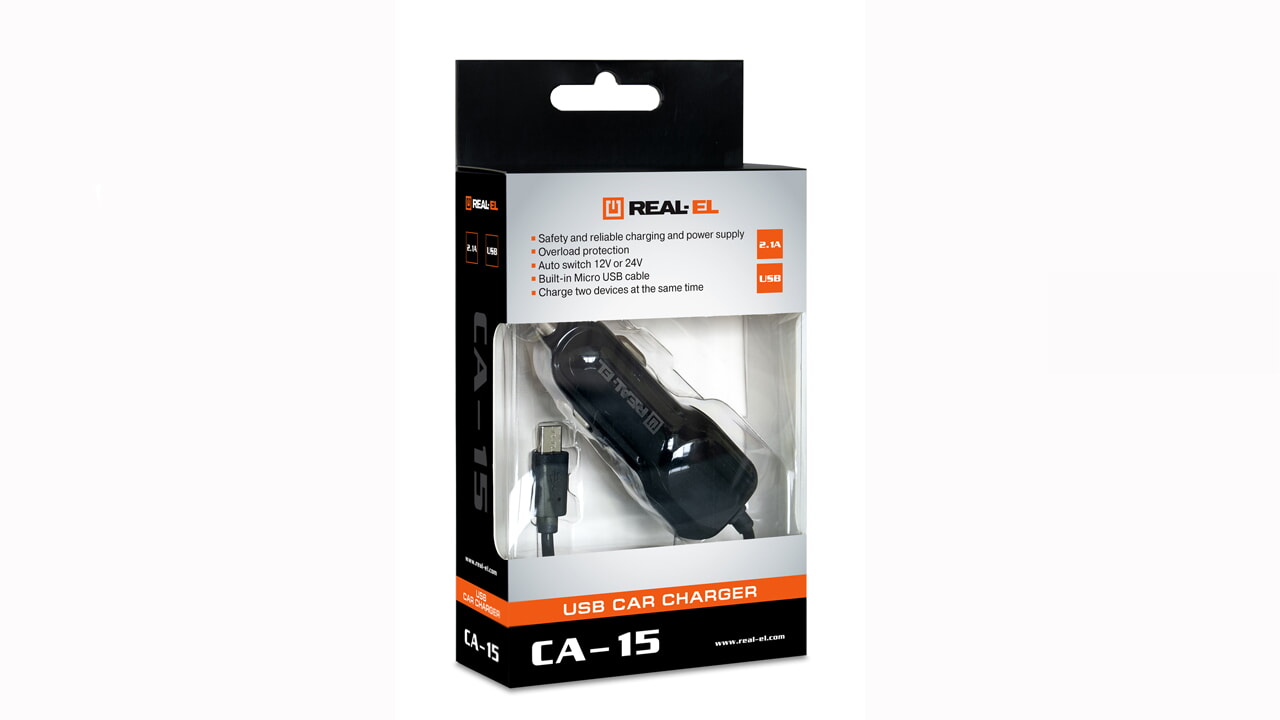 Автомобильное зарядное USB-устройство REAL-EL CA-15 с двумя выходами предназначенными для питания и зарядки аккумуляторов портативных устройств (мобильных телефонов, смартфонов, GPS-навигаторов, MP3-плееров, КПК, планшетных компьютеров и других цифровых устройств) через гнездо прикуривателя от бортовой сети автомобиля.