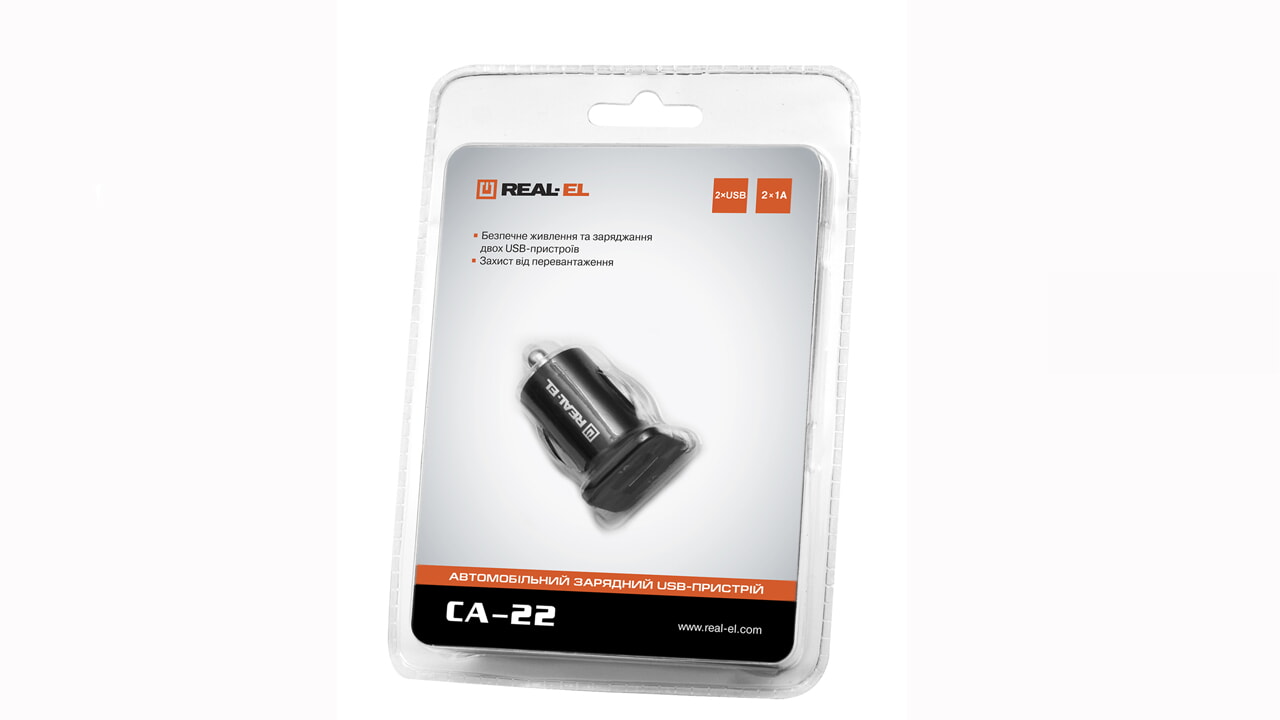 Автомобильное зарядное USB-устройство REAL-EL CA-22 с двумя выходами предназначено для питания и зарядки аккумуляторов портативных устройств (мобильных телефонов, смартфонов, GPS-навигаторов, MP3-плееров, КПК, планшетных компьютеров и других цифровых устройств) через гнездо прикуривателя от бортовой сети автомобиля.