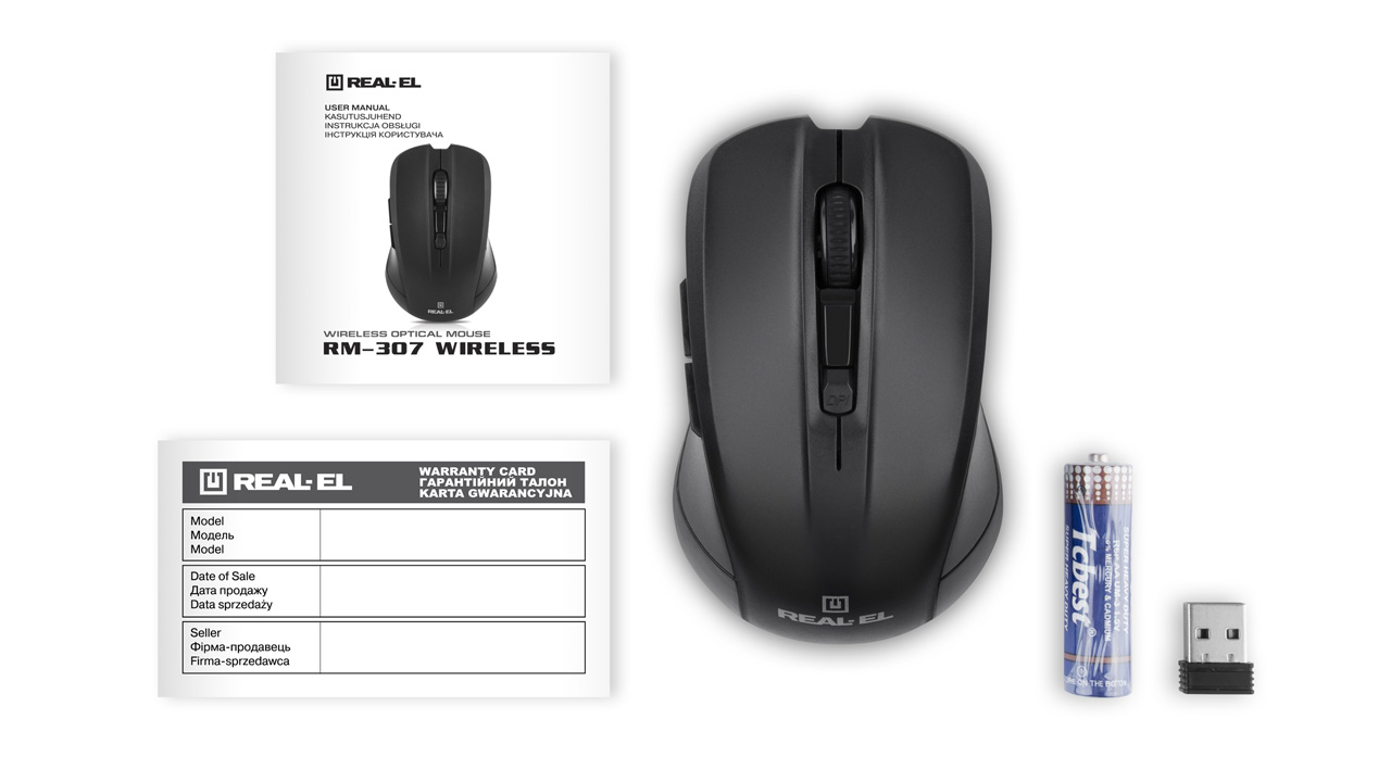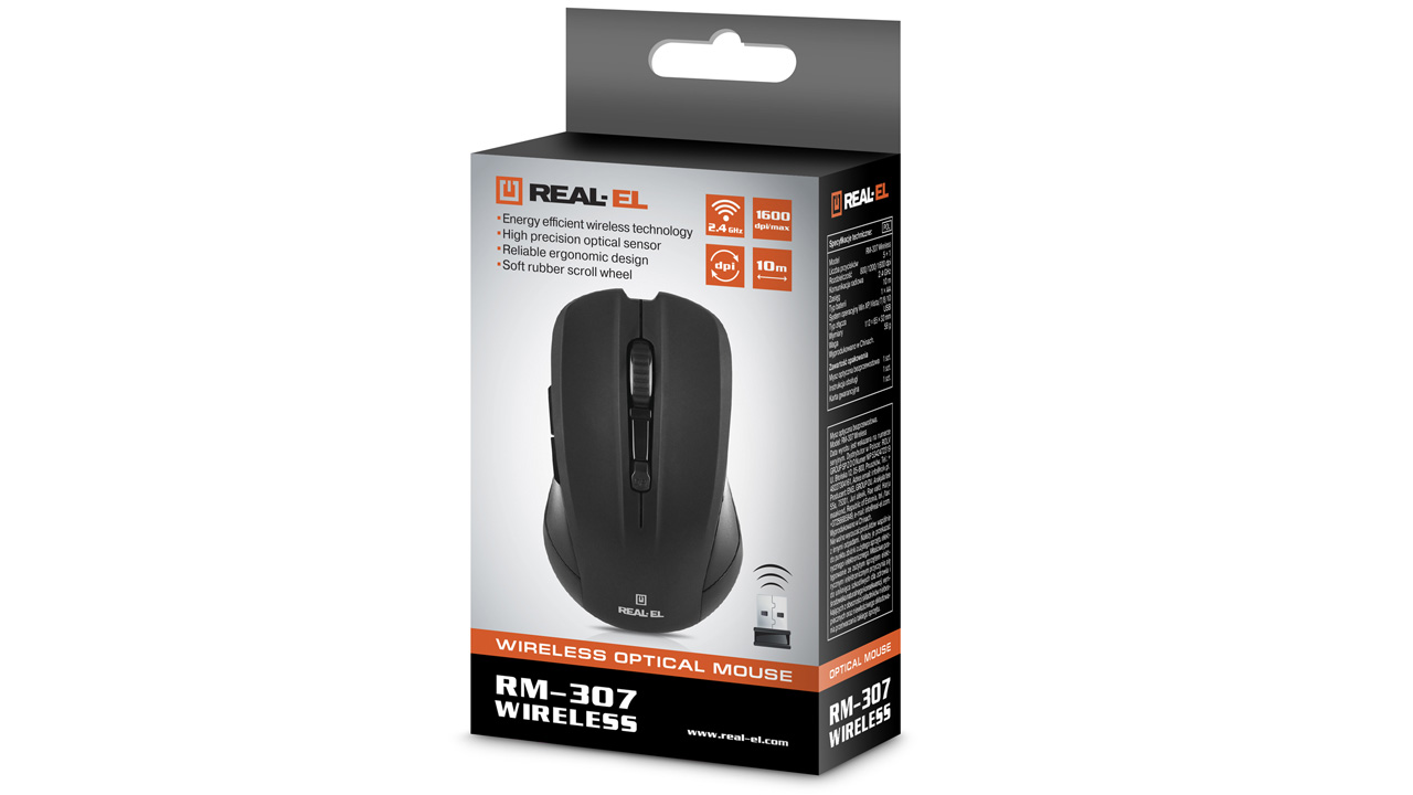 Энергоэффективная беспроводная технология позволяет манипулятору REAL-EL RM-307 Wireless работать практически на любой поверхности. Особенности: 5 + 1 клавиши, стильный эргономичный дизайн, колесо прокрутки, разрешающая способность – 1600 dpi, интерфейс USB, длительный срок службы батареек.