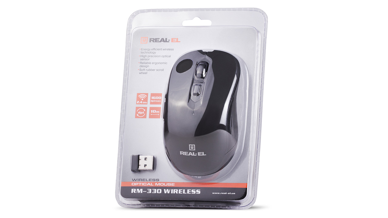 Энергоэффективная беспроводная технология позволяет манипулятору REAL-EL RM-330 Wireless работать практически на любой поверхности. Особенности: 5 + 1 клавиши, стильный эргономичный дизайн, колесо прокрутки, разрешающая способность – 1600 dpi, интерфейс USB, длительный срок службы батареек.