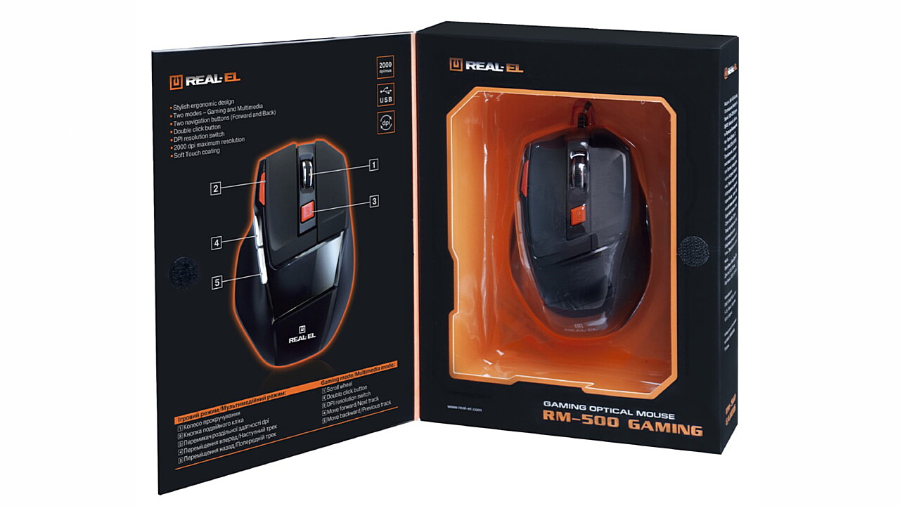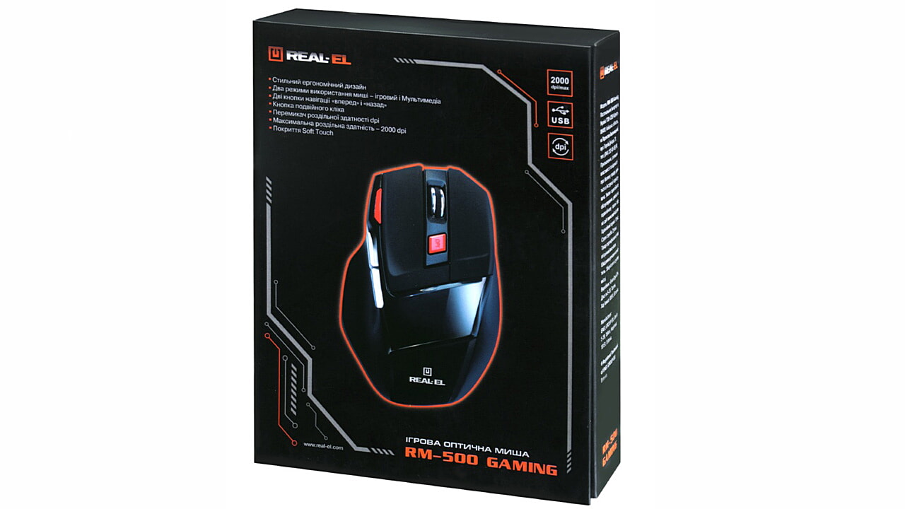 Высокоточная оптическая технология позволяет игровой компьютерной мыши REAL-EL RM-500 Gaming работать практически на любой поверхности. Особенности: высокая скорость работы, 6 + 1 клавиши, колесо прокрутки, кнопка двойного клика, переключатель разрешения DPI, голубая подсветка колеса прокрутки в режиме Мультимедиа, покрытие корпуса Soft Touch.
