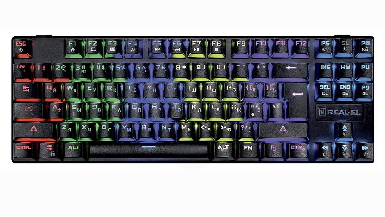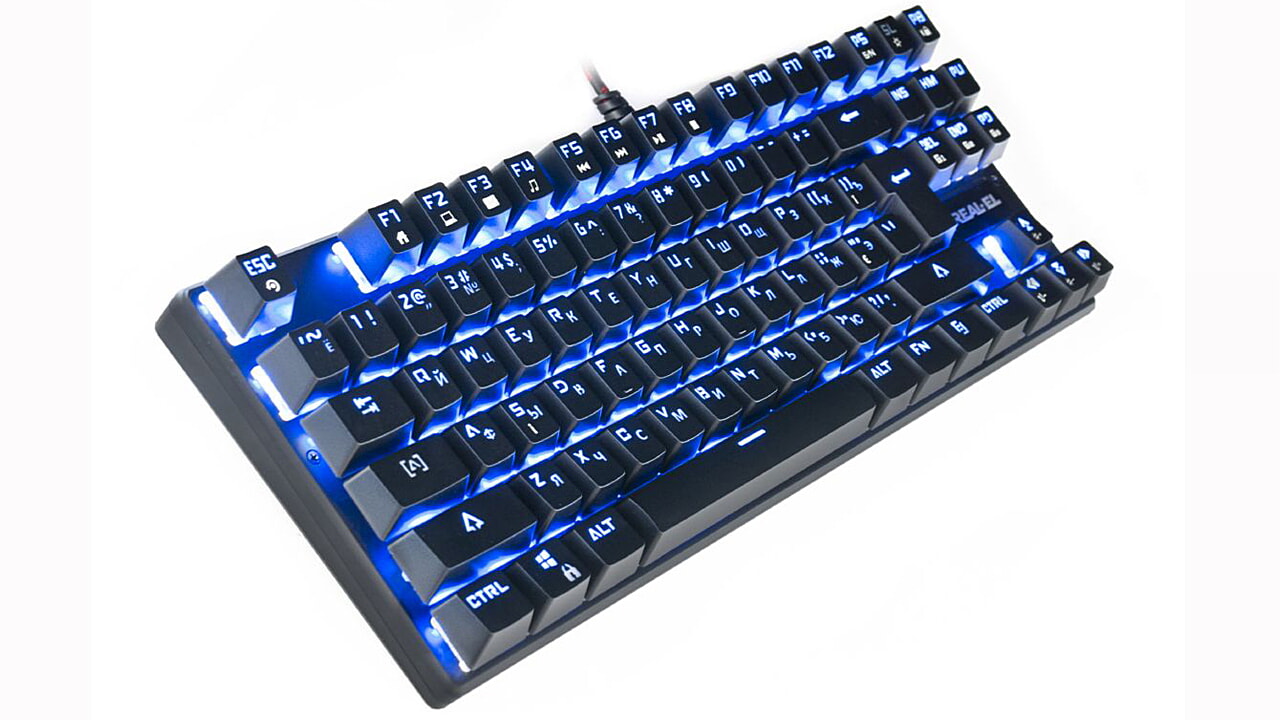Особенностью механической игровой клавиатуры REAL-EL M28 TKL RGB: металлическая основа, программируемые игровые режимы подсветки, подсветка всех символов с дополнительными световыми эффектами, надежные механические переключатели (BLUE SWITCH), 8 Fn кнопок быстрого доступа к Windows, Интернету и Мультимедиа.