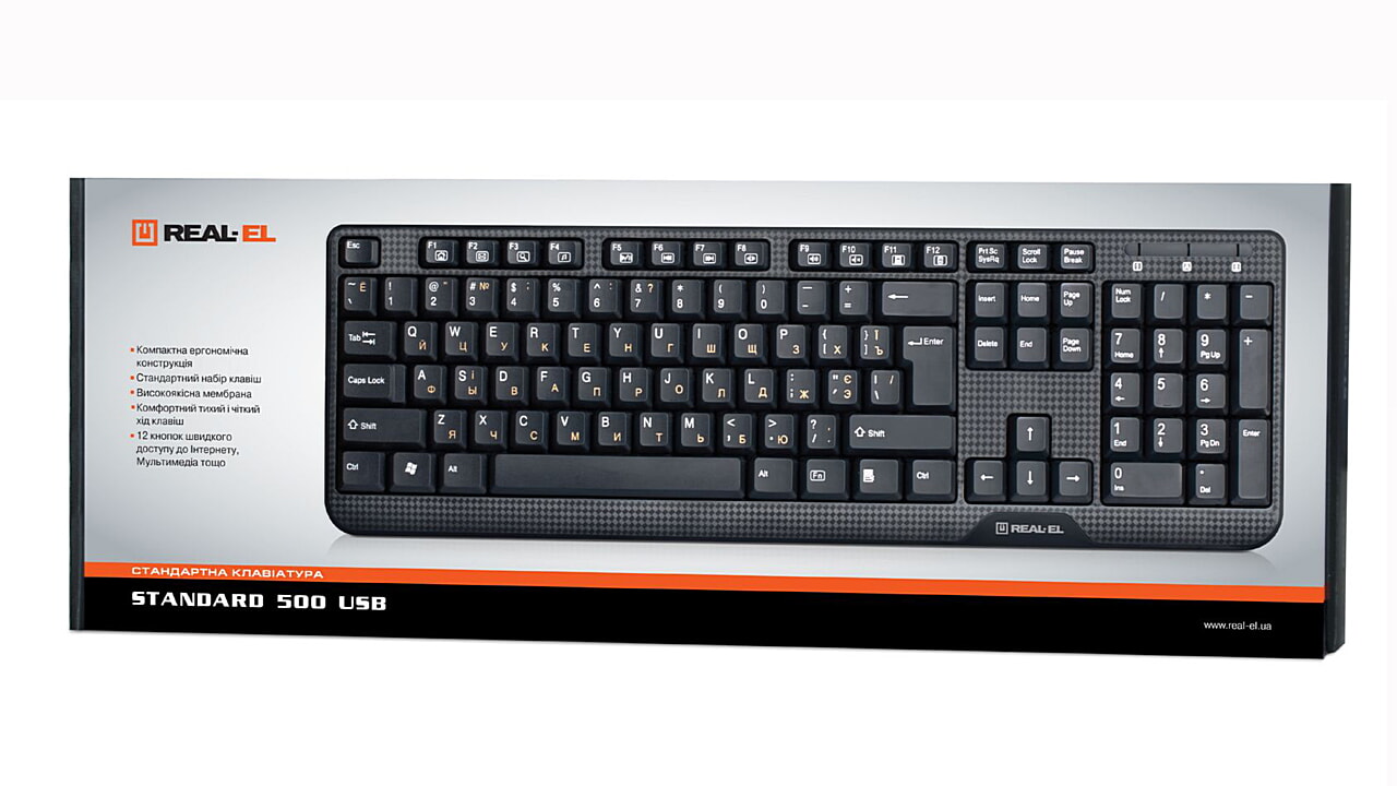 Клавиатура REAL-EL Standard 500 оснащена интерфейсом USB или PS/2. Ее установка осуществляется автоматически после подключения к USB либо PS/2 порту ПК. Высококачественная мембрана и тихий ход клавиш обеспечивают легкое и мягкое нажатие кнопок. Модель для удобства оснащена клавишей быстрого доступа к калькулятору.