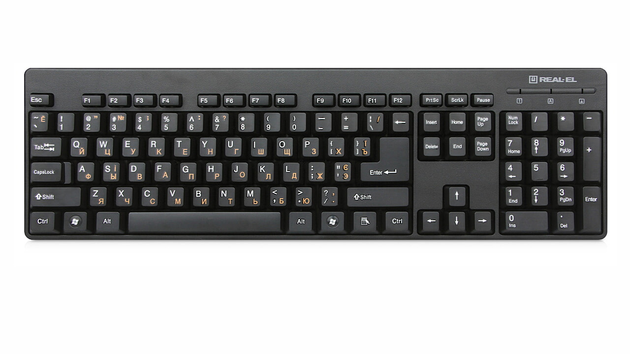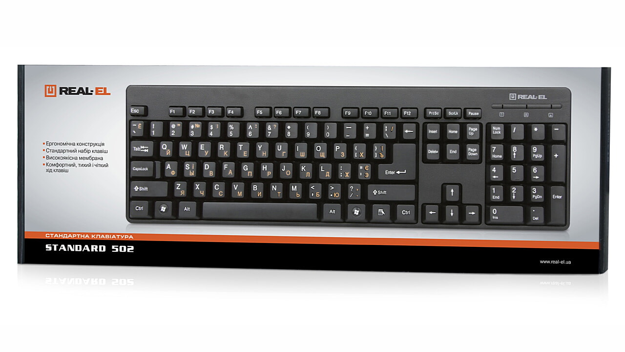 Эргономичная конструкция, стандартный набор клавиш, интерфейс USB, высококачественная мембрана, пониженный шум при работе – особенности клавиатуры REAL-EL Standard 502.