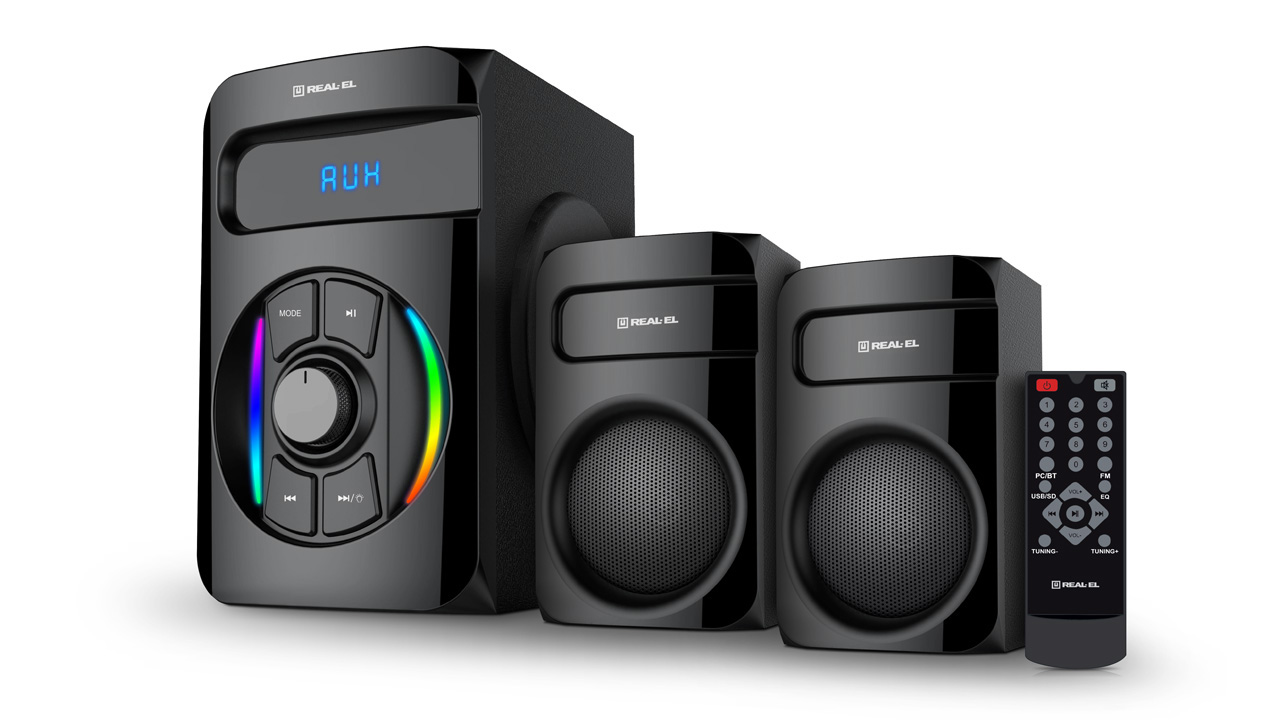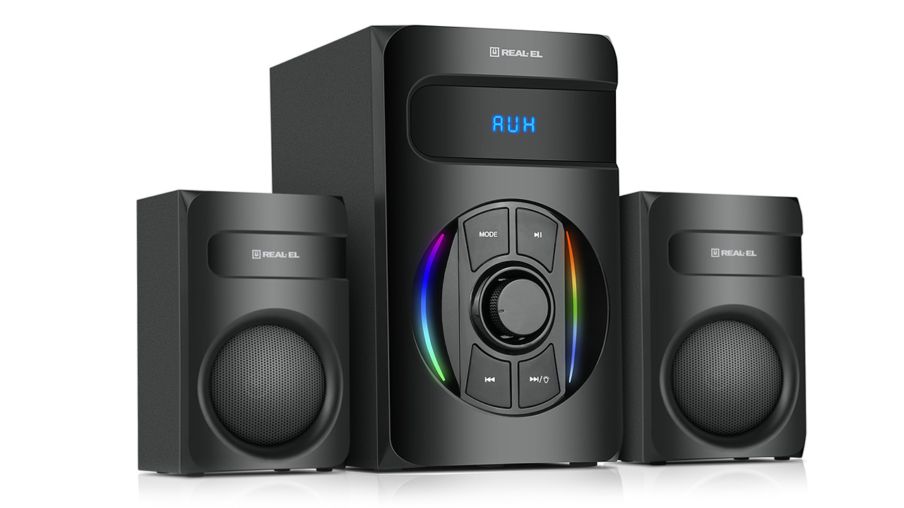 Мультимедийная акустическая система 2.1 REAL-EL M-375 с многоцветной подсветкой предназначена для воспроизведения музыки и озвучивания игр, фильмов и проч. АС может быть подключена практически к любым источникам аудиосигнала (CD/DVD-проигрывателям, телевизору, ПК и т. п.) без использования дополнительного усилителя мощности. АС имеет встроенные FM-радио, Bluetooth-модуль, и проигрыватель аудиофайлов USB flash, SD card.