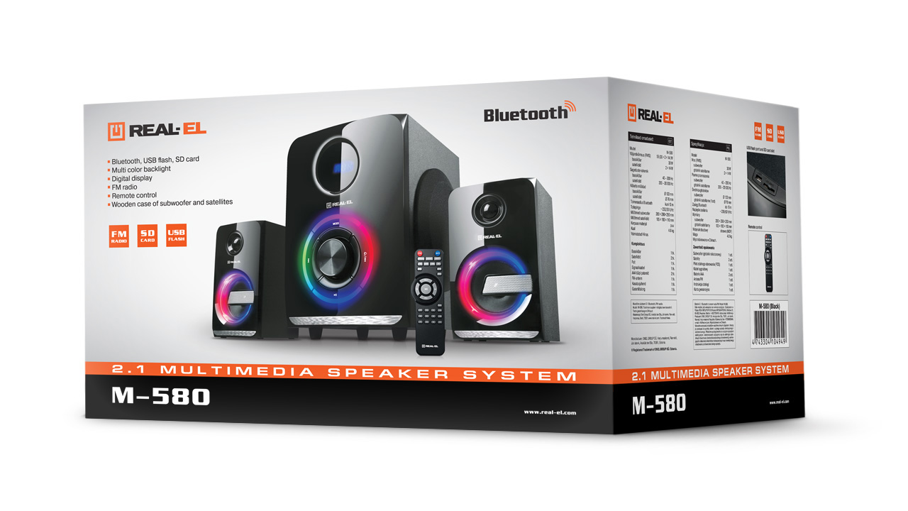 Колонки REAL-EL M-580 могут быть подключены практически к любым источникам аудио сигнала и имеют современные опции: пульт дистанционного управления, встроенный Bluetooth-модуль и FM-радио, проигрыватель аудио файлов с USB flash и SD card.