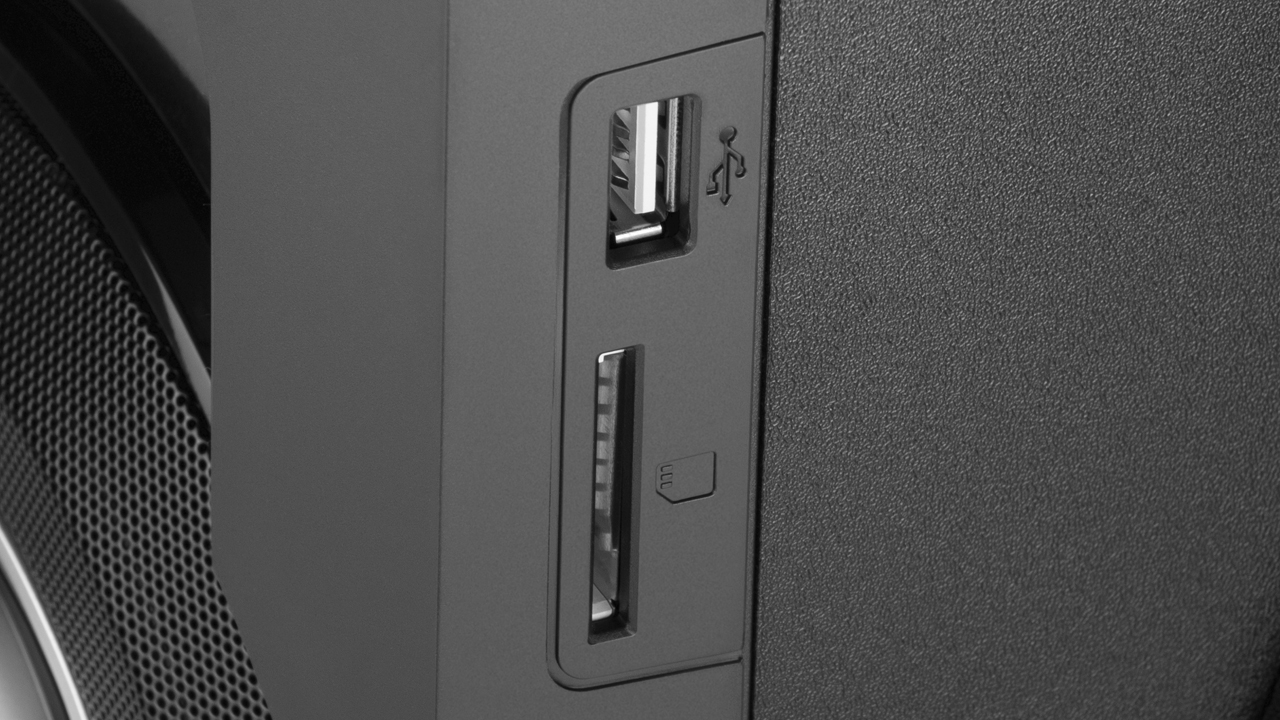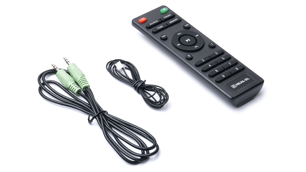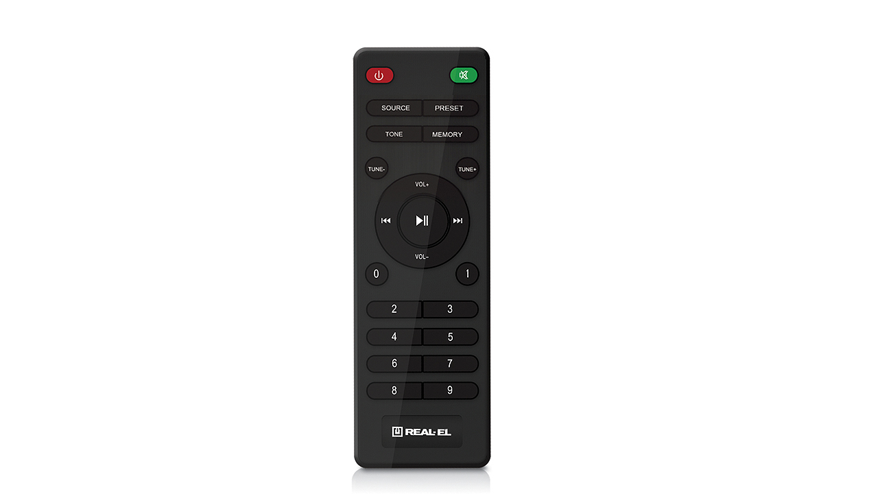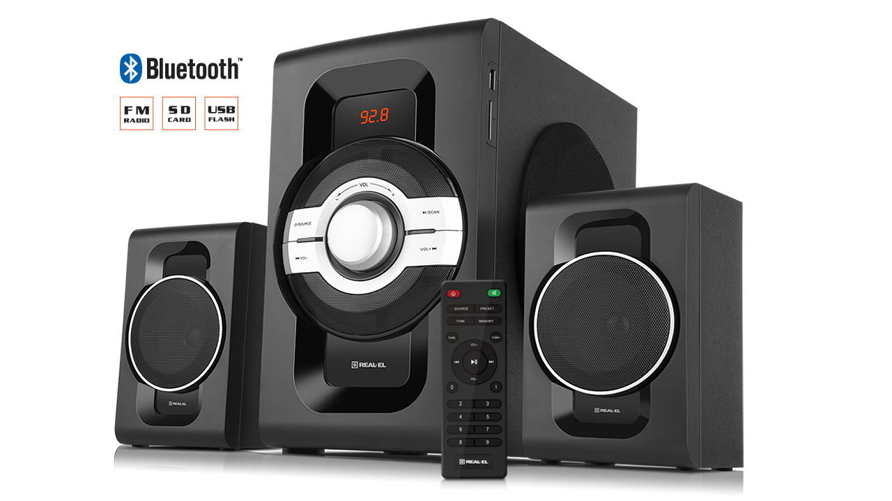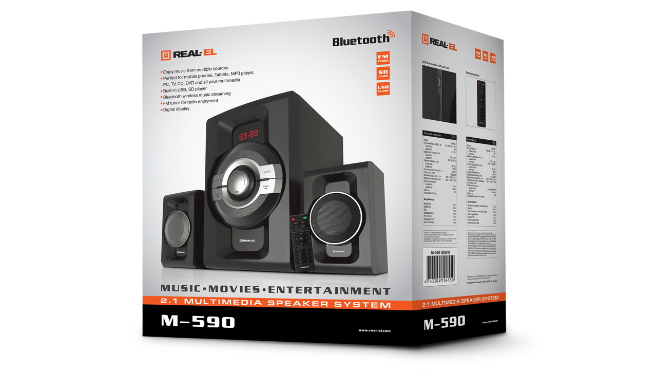 Расположенная на сабвуфере панель управления в сочетании с ПДУ позволит легко управлять системой, подключить ее можно практически к любому источнику аудио-сигнала: телевизору, компьютеру, телефону, а любители "старины" смогут прослушать музыку с CD/DVD проигрывателей. Сбоку на сабвуфере удобно расположены разъемы для подключения USB flash и SD card. Помимо привычного аудио-кабеля у REAL-EL M-590 есть возможность беспроводной передачи сигнала по Bluetooth.