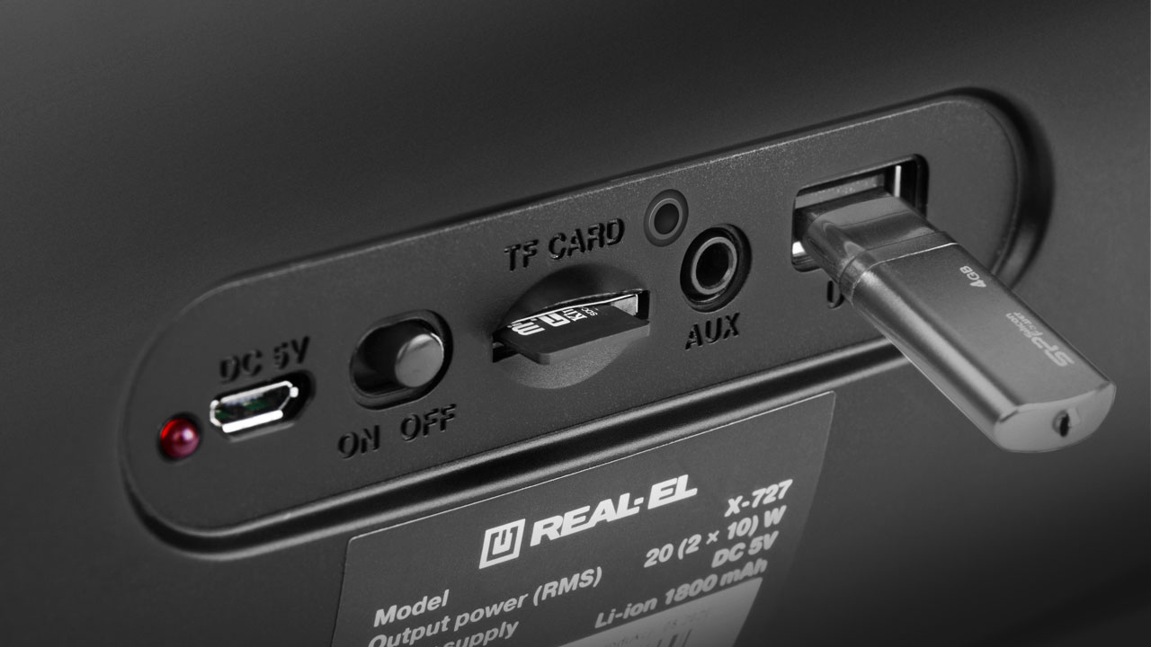 Мультимедийная портативная акустическая система REAL-EL X-727 имеет современный дизайн и качественный звук. Широкий функционал "бумбокса" позволяет прослушивать музыку подключая мобильное устройство, ПК, TV, ноутбуки и т. п., как через вывод AUX, так и по Bluetooth. USB и Micro SD card разъемы дают возможность прослушивать аудио-файлы с flash носителей. X-727 отличный спутник для отдыха на природе, литий-ионный аккумулятор на 1800 mAh DC 7.4V обеспечит вас музыкой на весьма длительное время.