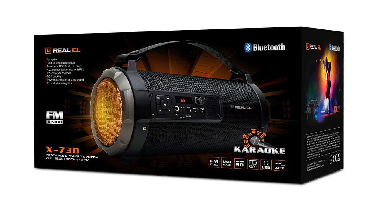 Мультимедийная портативная акустическая система REAL-EL X-730 имеет современный дизайн с яркой RGB подсветкой и качественным звучанием. Широкий функционал "бумбокса" позволяет прослушивать музыку подключая мобильное устройство, ПК, TV, ноутбуки и т. п., как через вывод AUX, так и по Bluetooth. USB и Micro SD card разъемы дают возможность прослушивать аудио-файлы с flash носителей. X-730 отличный спутник для отдыха на природе, литий-ионный аккумулятор на 2600 mAh обеспечит вас музыкой на весьма длительное время, а для любителей КАРАОКЕ имеется микрофонный разъем.