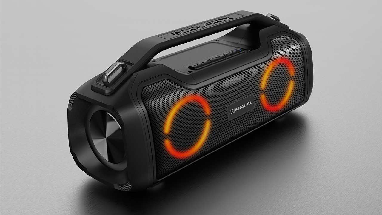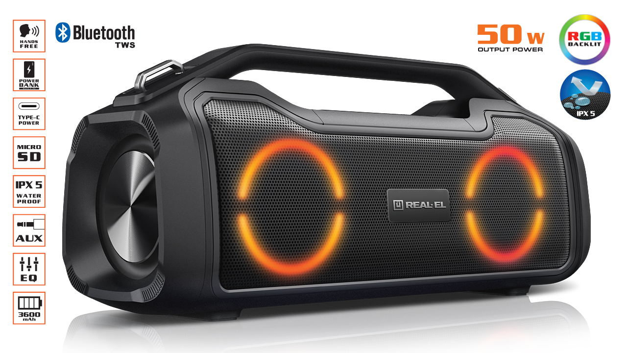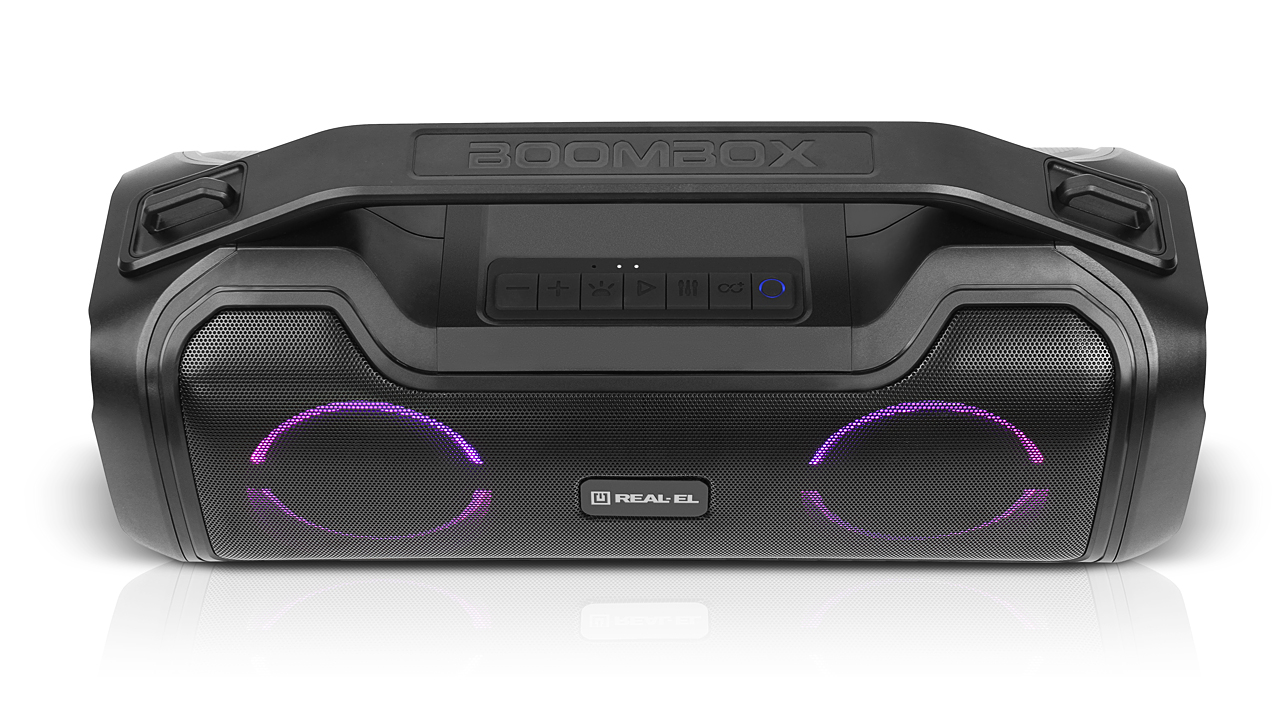 REAL-EL X-747 - это стильный, мощный бумбокс с RGB подсветкой, функцией TWS и встроенным эквалайзером.