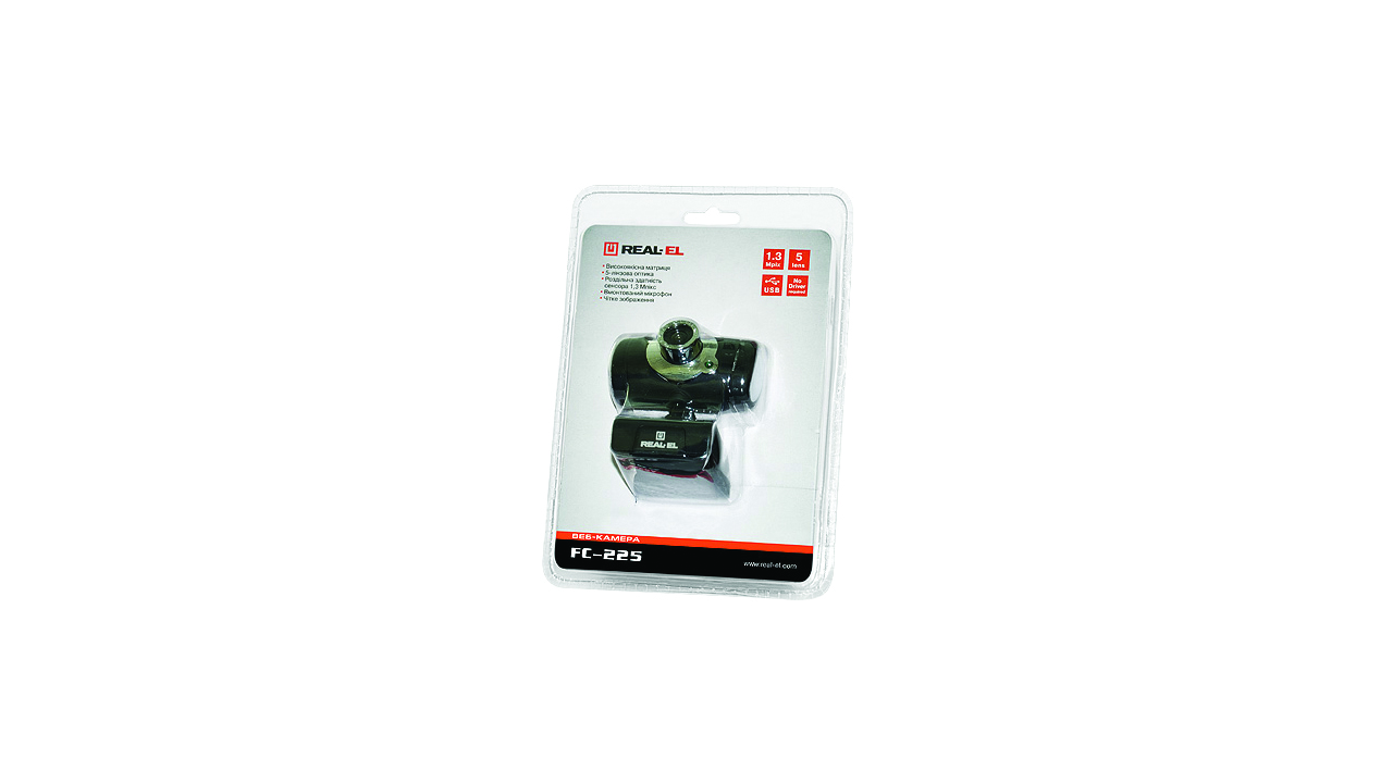 Веб-камера REAL-EL FC-225 имеет такие особенности: встроенный микрофон, разрешение сенсора 1,3 Мпикс, высококачественная 5-ти линзовая оптика и матрица высокого разрешения, настраиваемое фокусное расстояние, шариковый шарнир для поворота камеры под любым углом, клипса для установки камеры на столе, ноутбуке, LCD мониторе.