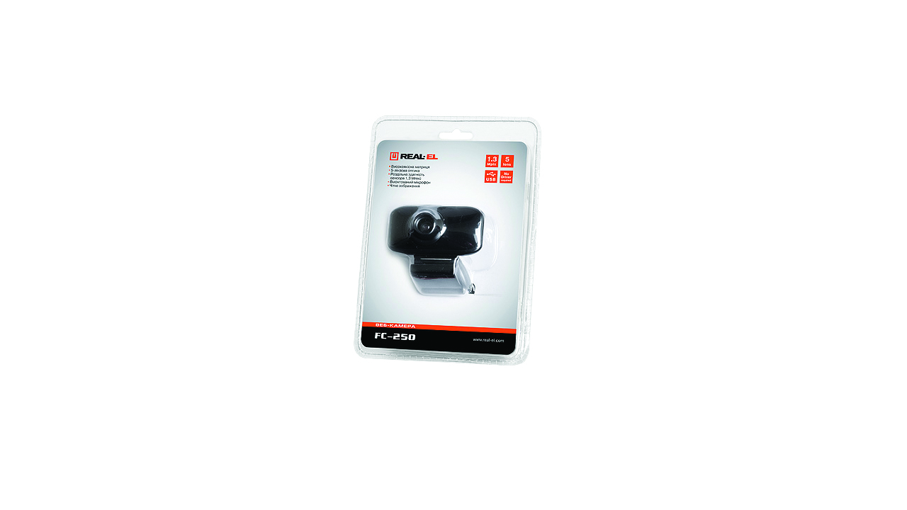 Веб-камера REAL-EL FC-250 имеет такие особенности: высококачественная 5-линзовая оптика, встроенный микрофон, настраиваемое фокусное расстояние, Plug&Play, шарнир для поворота камеры под нужным углом, клипса для установки камеры на столе, ноутбуке, LCD-мониторе.