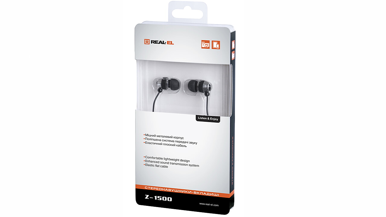 Наушники-вкладыши REAL-EL Z-1500 предназначены для работы со звуковыми картами ПК и другими совместимыми с ними системами (портативными проигрывателями, компьютерными игровыми приставками и т. п.).