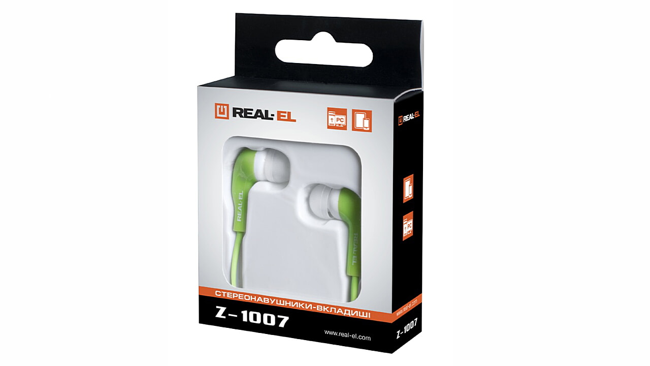 Наушники-вкладыши REAL-EL Z-1007 предназначены для работы со звуковыми картами ПК и другими совместимыми с ними системами (портативными проигрывателями, компьютерными игровыми приставками и т. п.).