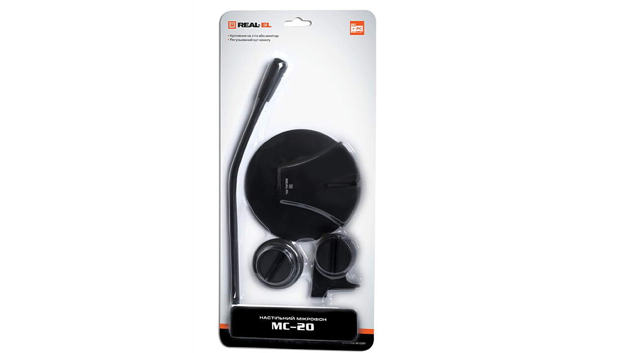 Микрофон настольный REAL-EL MC-20 предназначен для общения через Интернет, записи слов и фраз при изучении иностранных языков. Гибкая ножка, на которой установлен микрофонный капсюль, позволяет изменять положение микрофона. Массивное основание обеспечивает устойчивость модели.