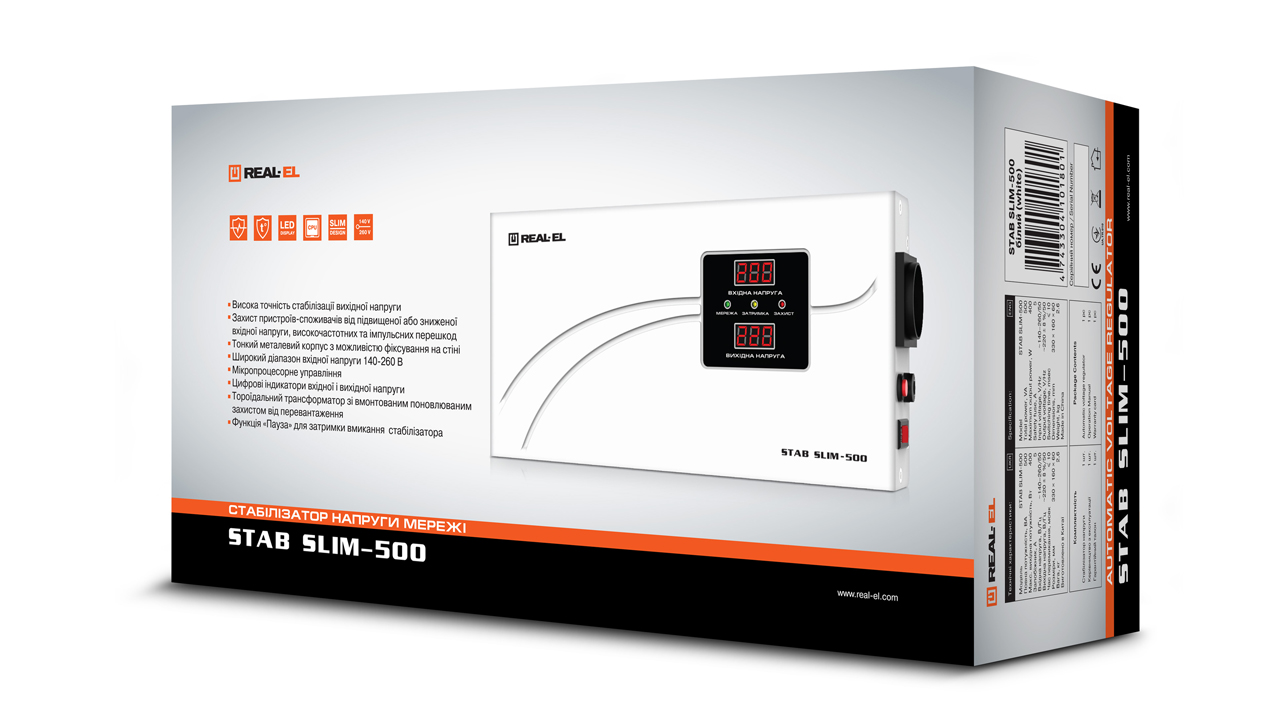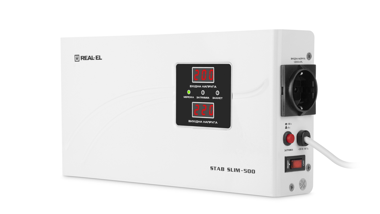 Стабилизатор напряжения REAL-EL STAB SLIM-500 предназначен для обеспечения качественным и стабильным электропитанием разных потребителей, защиты устройств-потребителей от недопустимых отклонений напряжения, высокочастотных и импульсных помех.
