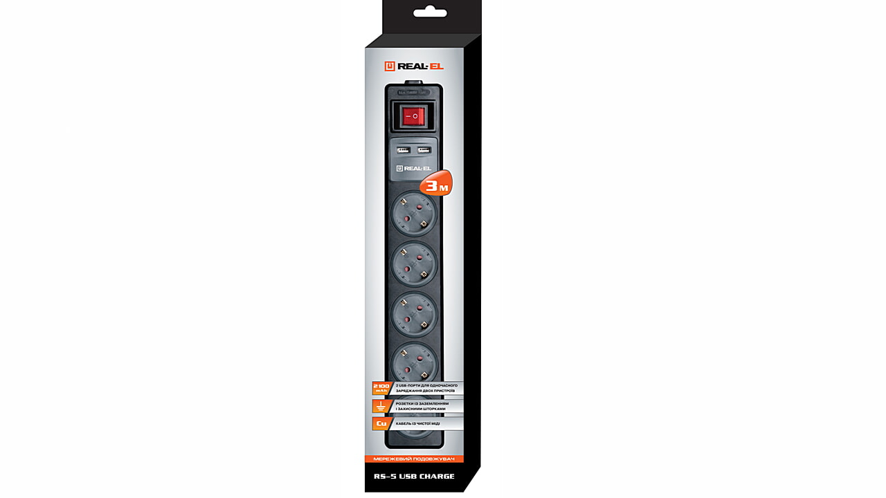 Сетевой удлинитель REAL-EL RS-5 USB Charge со встроенным USB зарядным устройством предназначен для подключения к электрической сети электроприборов и одновременной зарядки двух устройств. Имеет 5 розеток с заземлением и защитными шторками и 2 USB-порты для зарядки.