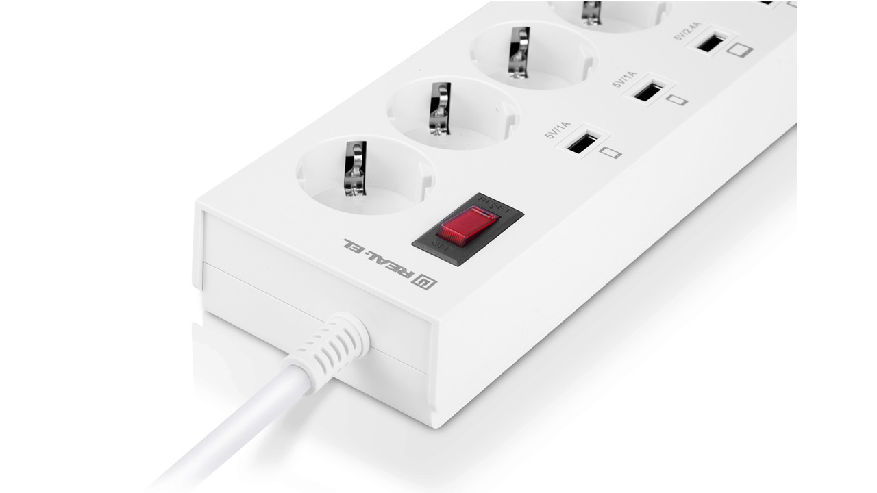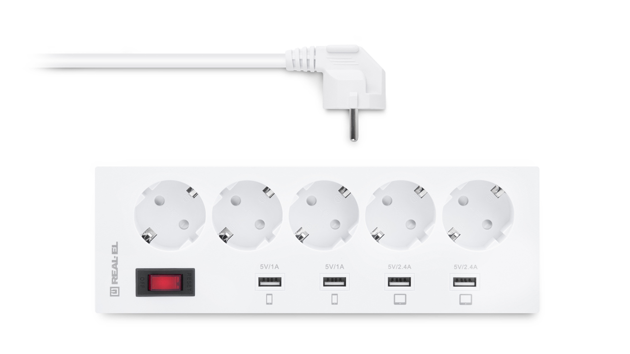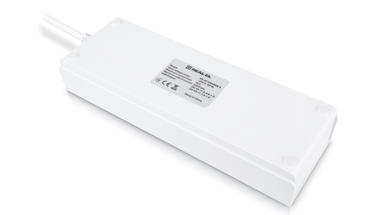Сетевой фильтр-удлинитель REAL-EL RS-5F Charge 4 со встроенным USB зарядным устройством предназначен для подключения к электрической сети электроприборов и обеспечения их защиты от высоковольтных импульсов напряжения и постоянной фильтрации высокочастотных помех.