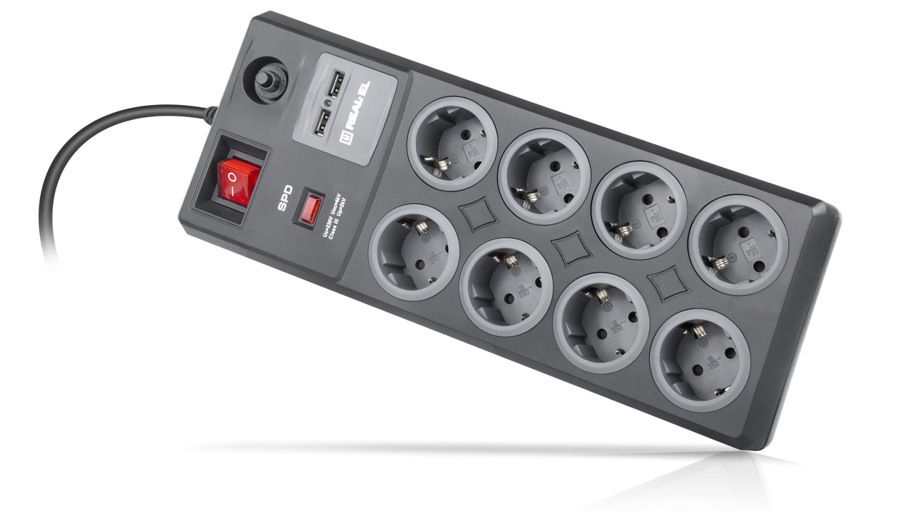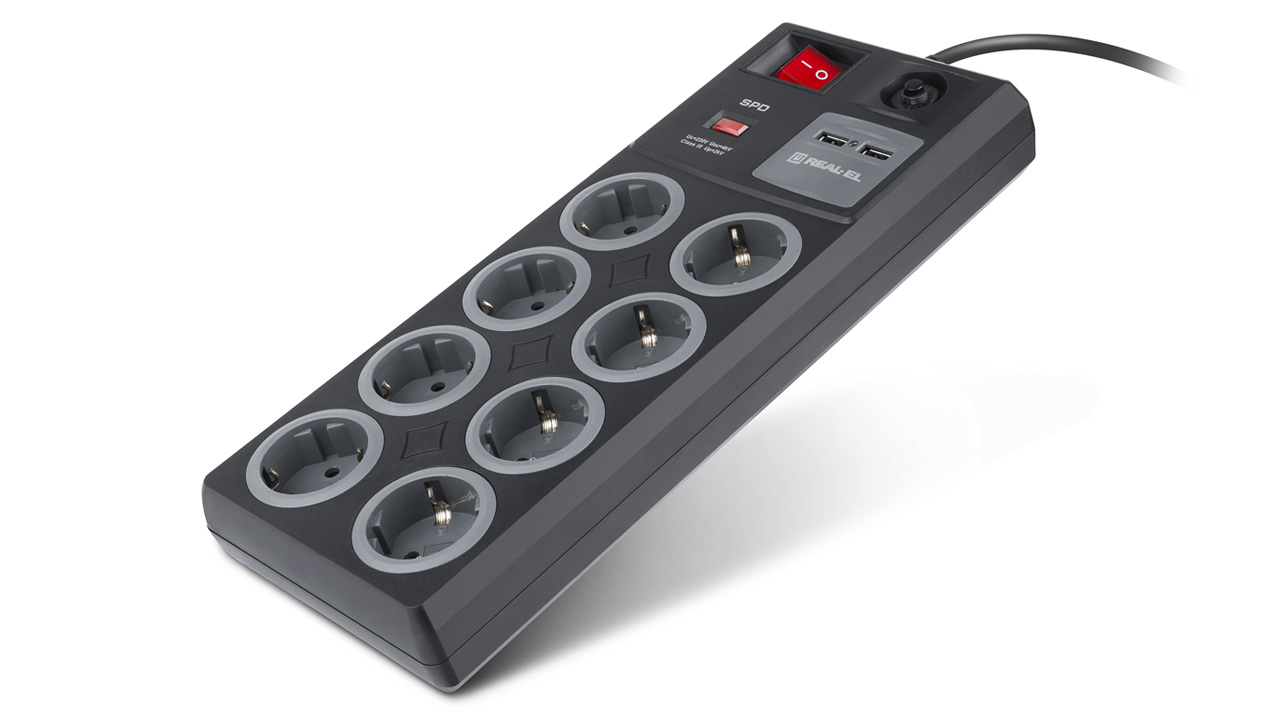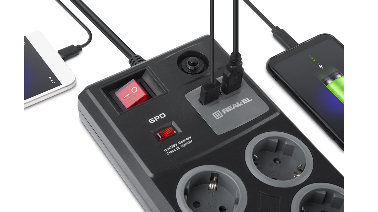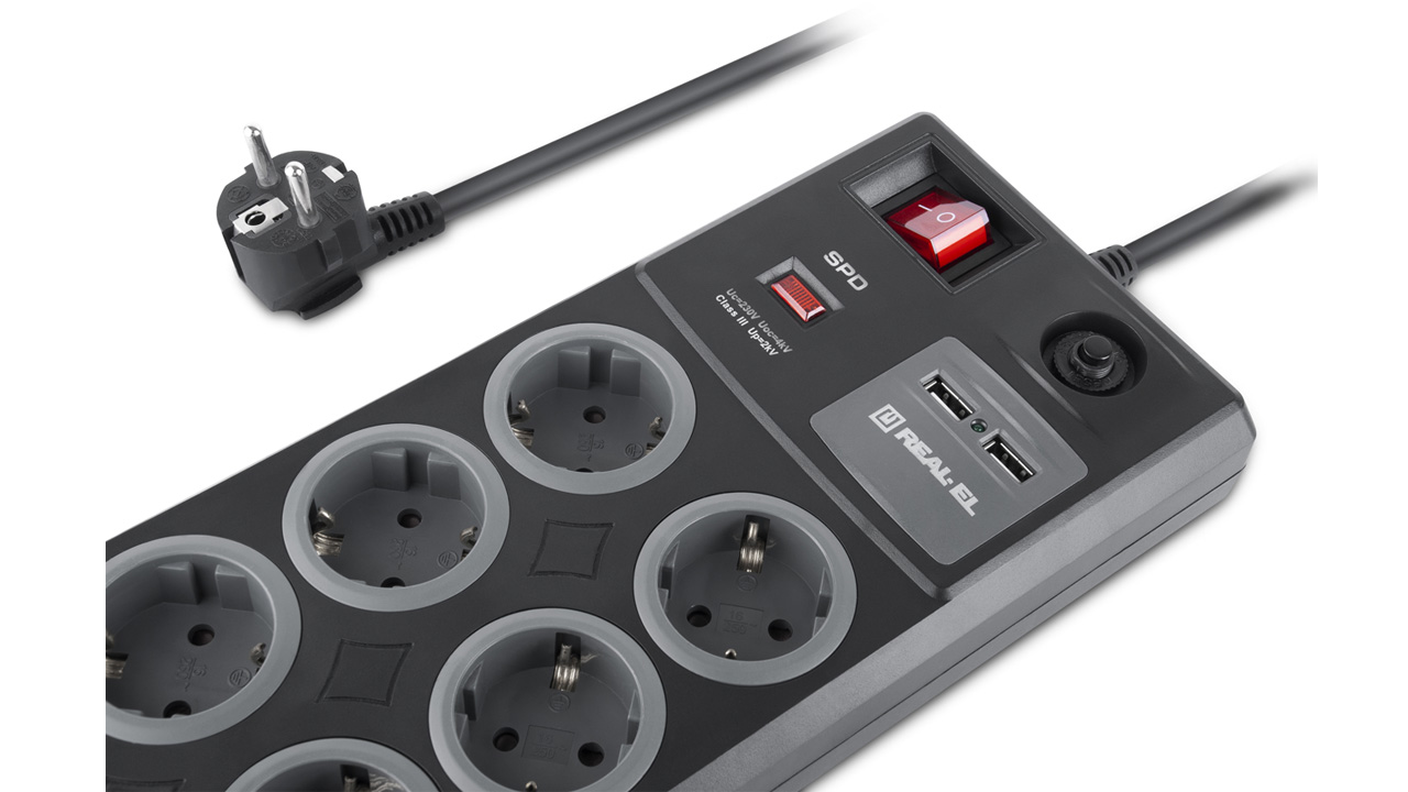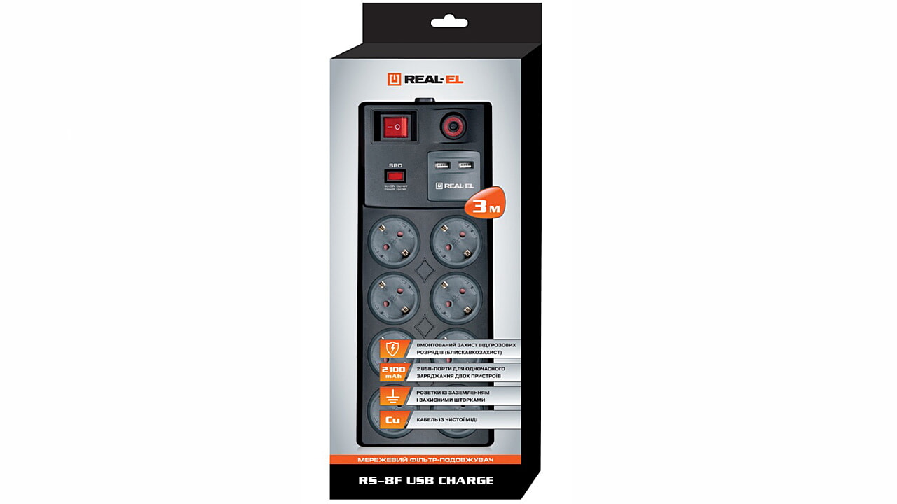 Сетевой фильтр-удлинитель REAL-EL RS-8F USB Charge со встроенным USB зарядным устройством предназначен для подключения к электрической сети электроприборов и обеспечения их защиты от высоковольтных импульсов напряжения и постоянной фильтрации высокочастотных помех.