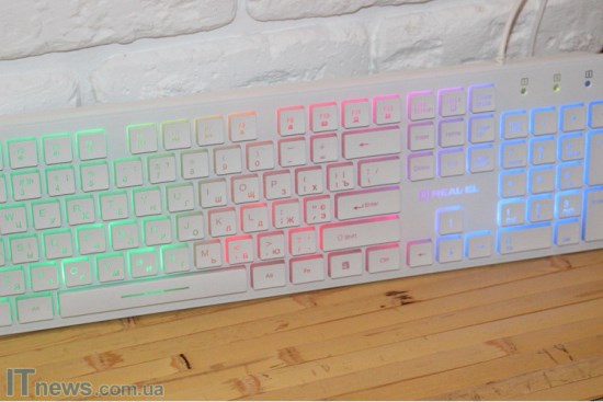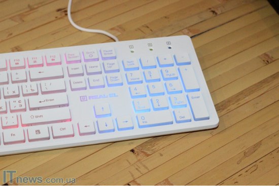С подсветкой поступили забавно. В REAL-EL 7070 Comfort Backlit она нескольких цветов: зеленый, красный и др. Но что интересно - все задействованы одновременно. Однако свет здесь не хаотичный, а зональный, то есть, за каждой расцветкой закреплена своя часть клавиатуры. Ход очень любопытный, и уж точно понравится девушкам. Кстати, подсвечиваются не только сами символы на кнопках, но и также "боковушки" каждой клавиши, что говорит об особом внимании к ключевой особенности продукта. Ну и при необходимости подсветку, конечно же, можно отключить.