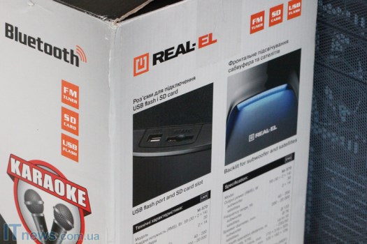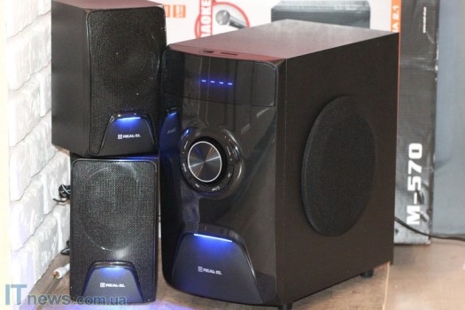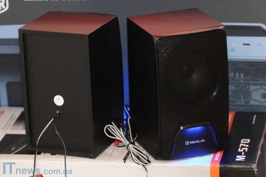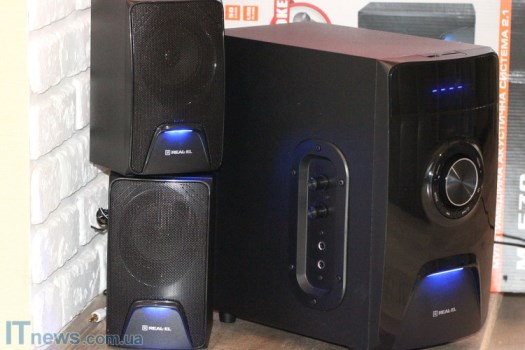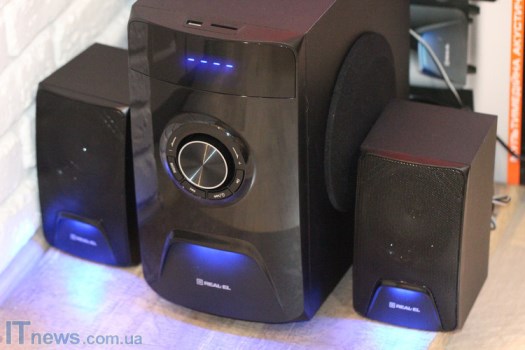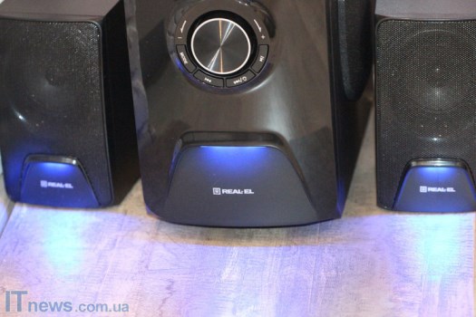 С колонками все значительно проще. К примеру, спереди большие металлические сетки, за которыми "прячутся" динамики. Немногим ниже сеток - светодиоды, а еще есть логотипы REAL-EL.