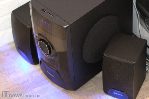 Доступная по цене акустическая система 2.1 с симпатичной подсветкой сабвуфера и динамиков, возможностью воспроизведения МР3 с карт памяти и USB-накопителей, передачей аудио посредством Bluetooth и кабельного подключения, встроенным FM-приемником и даже модулем караоке с выходами под два микрофона.