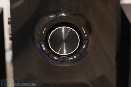 Взглянем для начала на сабвуфер. В самом верху спереди у него дисплей. Чуть ниже большой вал для регулировки громкости звука, а также четыре кнопки. Первая, именуемая MODE, позволяет выбрать источник воспроизведения либо же настроить беспроводное подключение. Возможности трех остальных клавиш понятны без дополнительных объяснений, поскольку на каждой есть всем известные сноски.