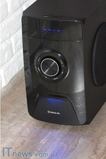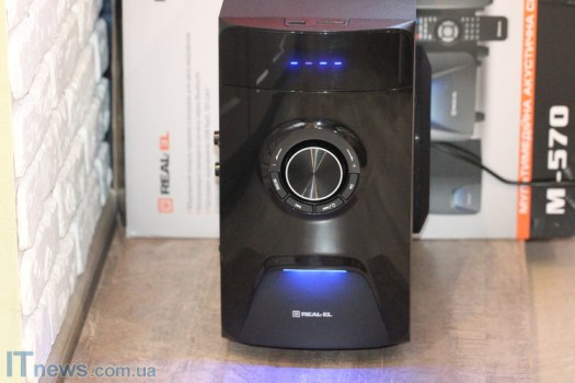 Экран у REAL-EL M-570 вынесен в верхнюю часть передней панели сабвуфера. Он здесь однострочный с синей подсветкой. Поскольку данная модель акустики для помещений, а не для улицы, упрекать производителя в тусклости подсветки, как минимум, не корректно. Да и потом, именно такой формат подсветки – дизайнерский штрих производителя.