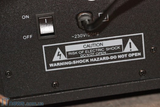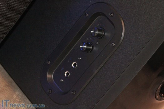 Сзади есть излучатель, несколько информационных наклеек, а также переключатель питания и его вывод, вал, регулирующий уровень тембра HЧ плюс выводы для подключения антенны и колонок. Отдельно обозначены разъемы для кабелей питания светодиодов на колонках.