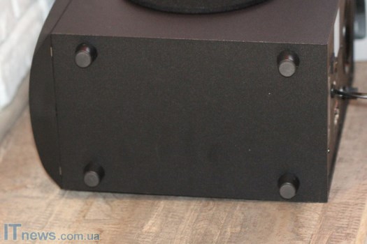 Ключевой материал корпуса, как сабвуфера, так и динамиков – дерево. Из него сделаны все стороны, за исключением передней панели, которая у колонок почти полностью прикрыта металлической сеткой, а у сабвуфера получилась пластиковой. Каких-либо резиновых вставок здесь нет. В качестве антивибрационных ножек на нижних площадках колонок пропиленовые насадки. Такие же элементы и на пластиковых ножках "саба".