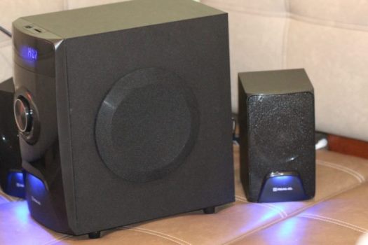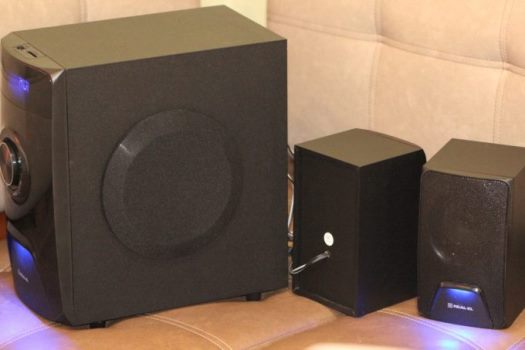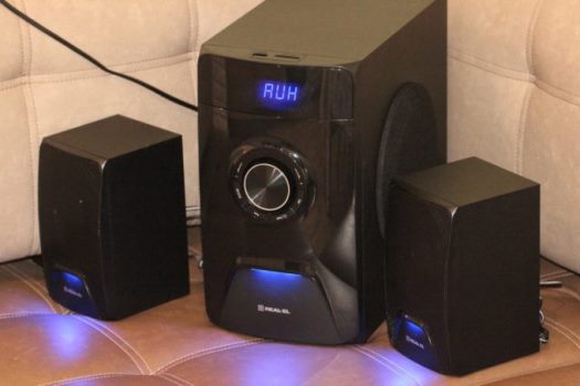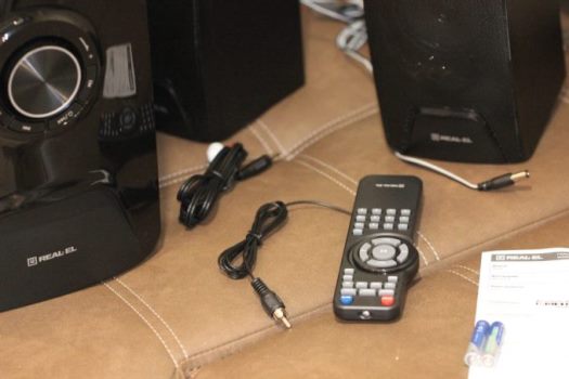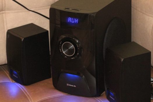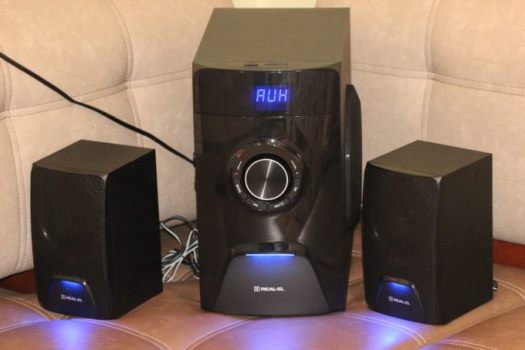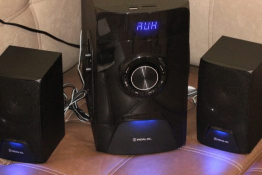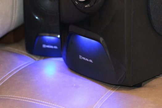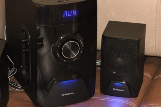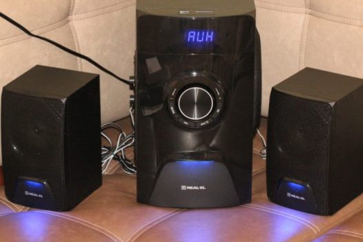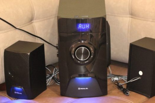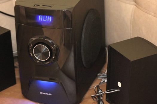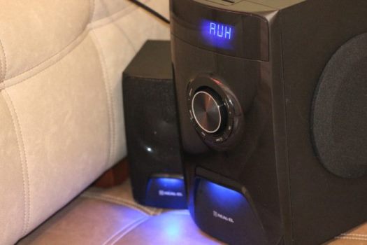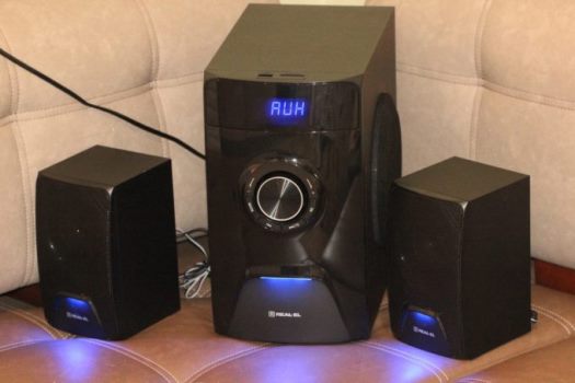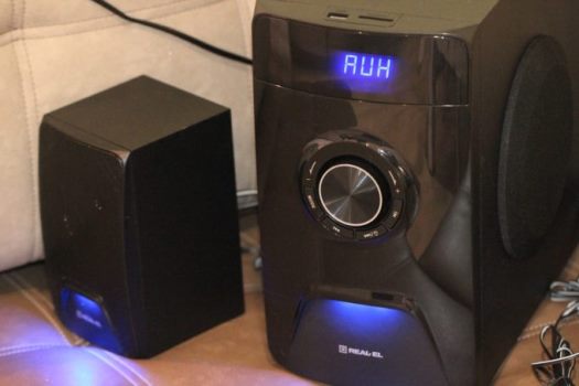 REAL-EL M-570 – небольшая акустическая система класса 2.1, которая лично меня заинтересовала встроенной системой караоке. Кроме того, здесь красивая подсветка как на сабвуфере, так и динамиках, возможность проигрывать аудио со съемных носителей, проводное и беспроводное подключение к внешнему источнику звука и даже пульт ДУ.