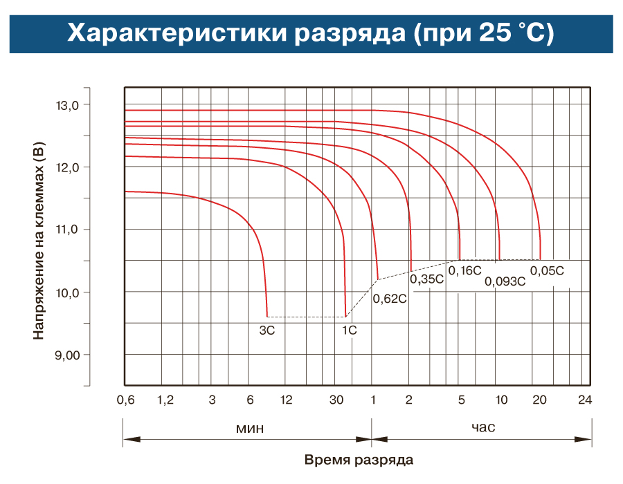 Из приведенного графика видно, что при токе разряда 0,05С (0,05 × 50 = 2,5 А для этой батареи), аккумулятор будет разряжаться 20 часов и отдаст в нагрузку 2,5 × 20 = 50 А • ч (50 А • ч – номинальная емкость аккумулятора). Разрядная емкость, на которую рассчитан аккумулятор и которая указывается изготовителем, называется