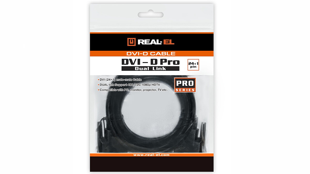 REAL-EL DVI-D – DVI-D (24+1) Pro призначений для підключення пристроїв, що мають порти DVI-D.