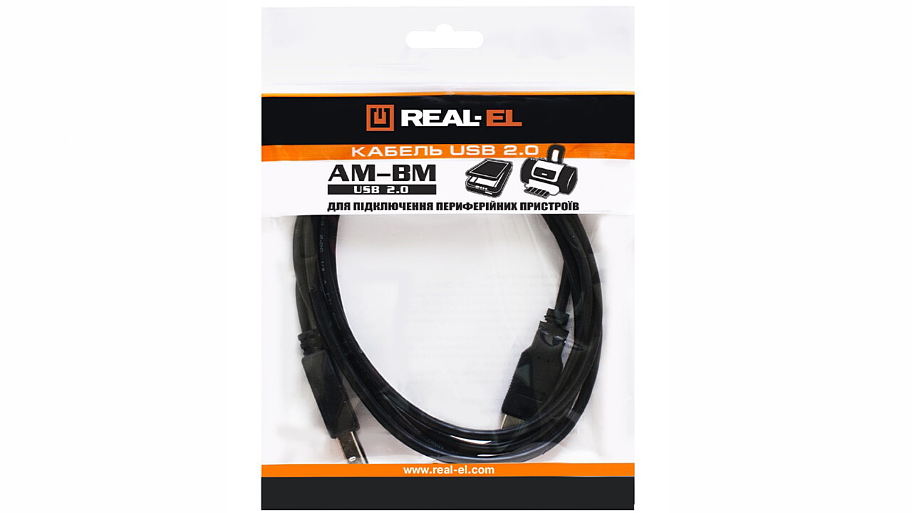 Кабель REAL-EL USB 2.0 Am-Bm служить для підключення комп’ютера до портативних пристроїв, розгалужувачів, принтерів, сканерів тощо.