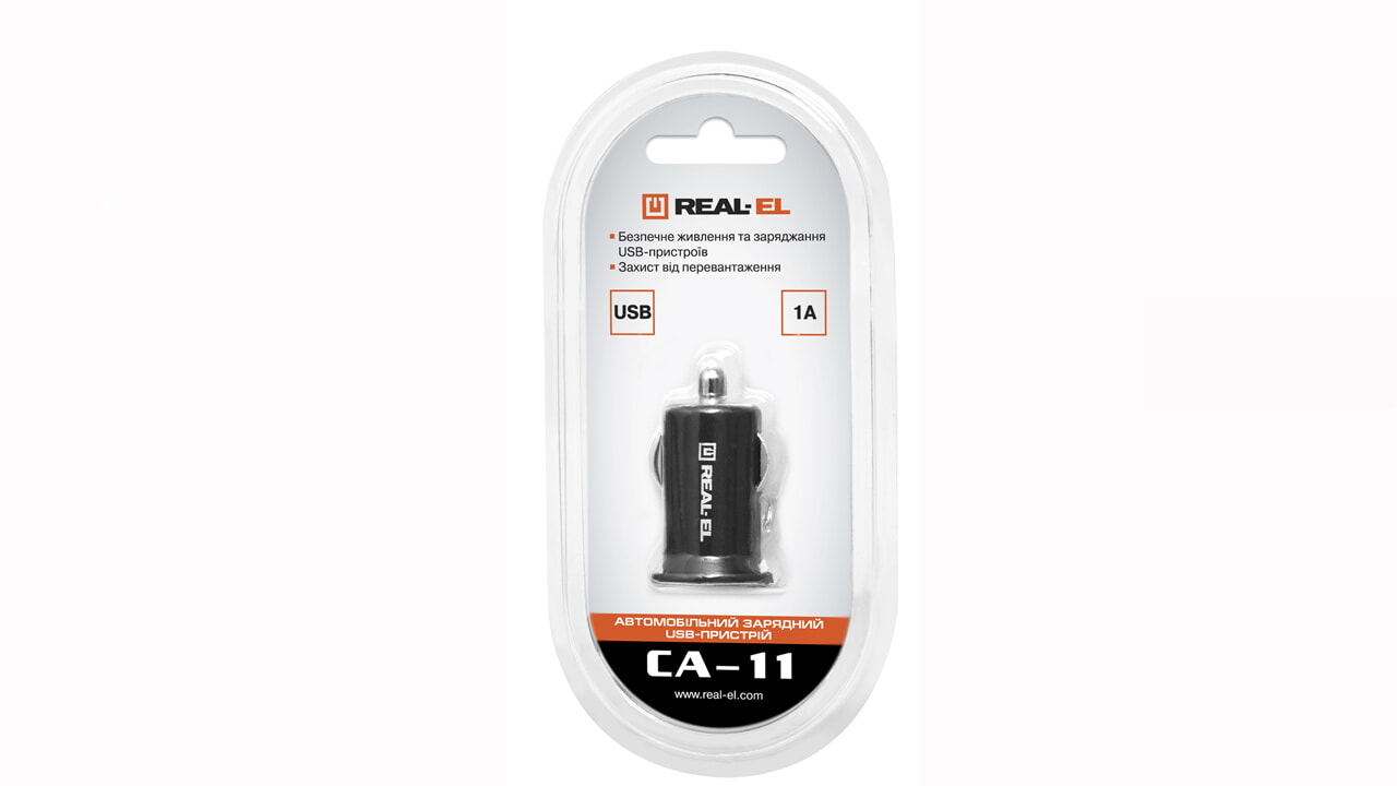 Автомобільний зарядний USB-пристрій REAL-EL CA-11 з одним виходом призначено для живлення та заряджання акумуляторів портативних прист- роїв (мобільних телефонів, смартфонів, GPS-навігаторів, MP3-плеєрів, КПК, планшетних комп’ютерів та інших цифрових пристроїв) через гніздо прикурювача від бортової мережі автомобіля.