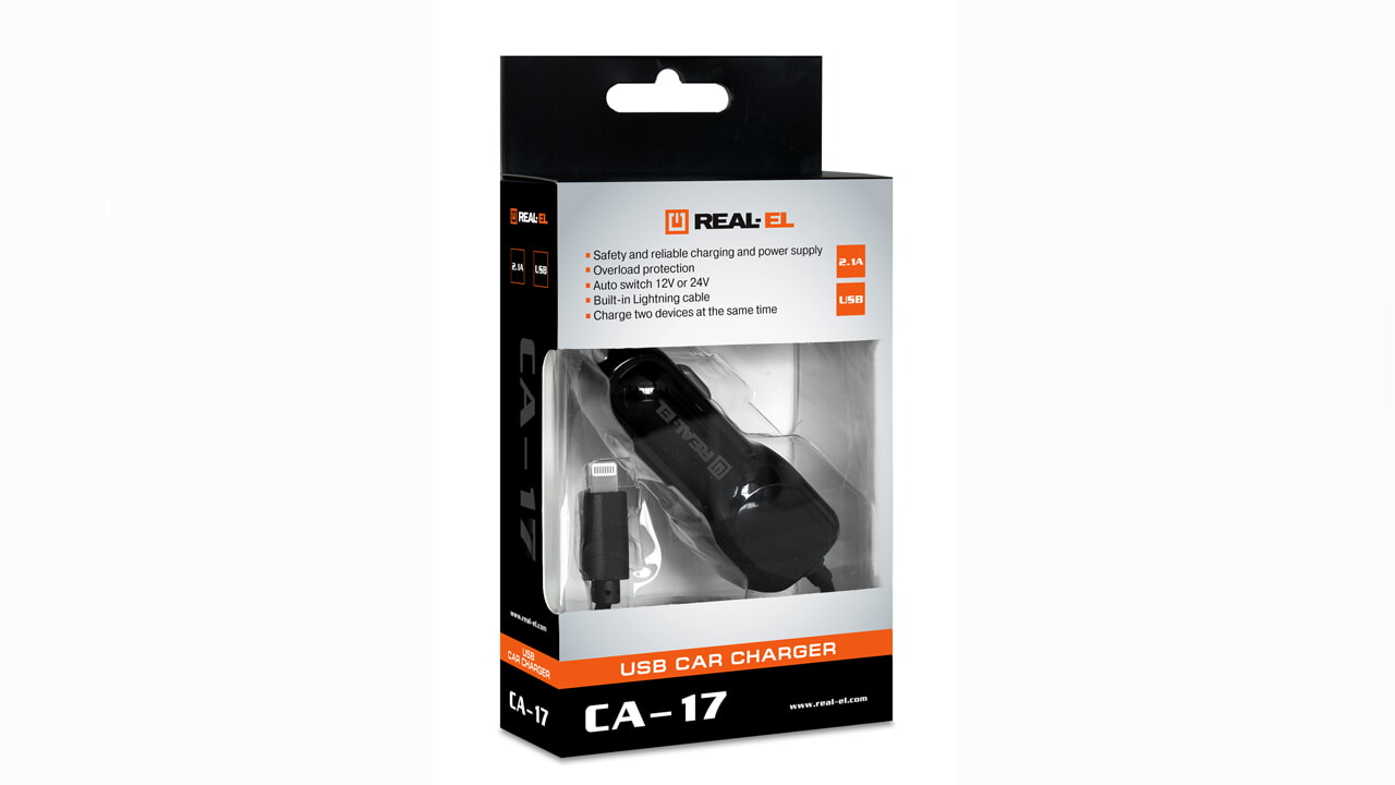 Автомобільний зарядний USB-пристрій REAL-EL CA-17 з двома виходами призначено для живлення та заряджання акумуляторів портативних пристроїв (мобільних телефонів, смартфонів, GPS-навігаторів, MP3-плеєрів, КПК, планшетних комп’ютерів та інших цифрових пристроїв) через гніздо прикурювача від бортової мережі автомобіля.