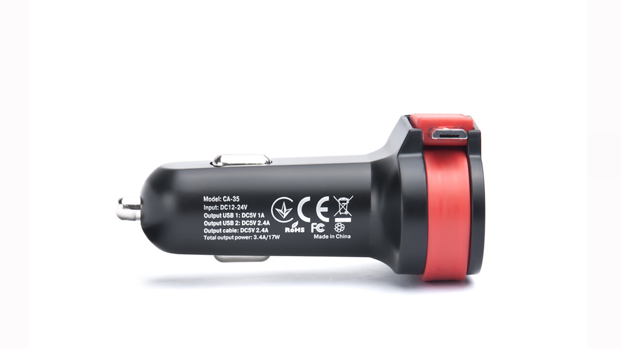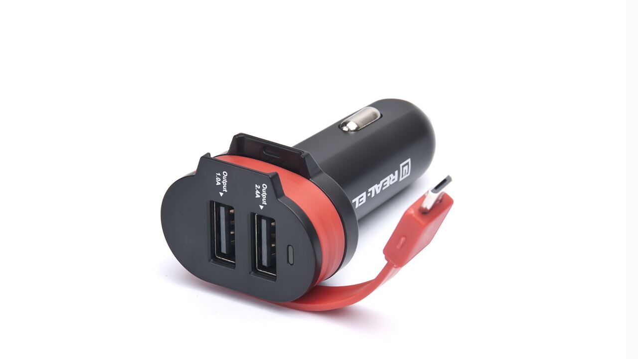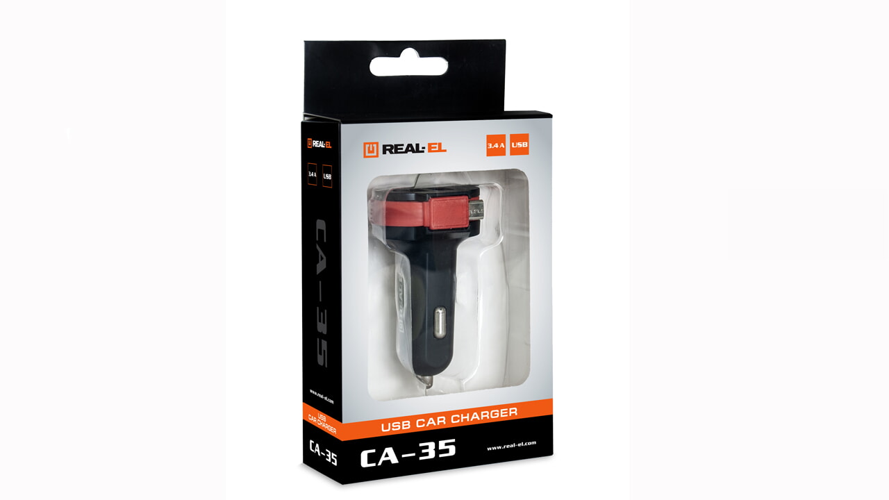 Автомобільний зарядний USB-пристрій REAL-EL CA-35 з трьома виходами призначено для живлення та заряджання акумуляторів портативних пристроїв (мобільних телефонів, смартфонів, GPS-навігаторів, MP3-плеєрів, КПК, планшетних комп’ютерів та інших цифрових пристроїв) через гніздо прикурювача від бортової мережі автомобіля.