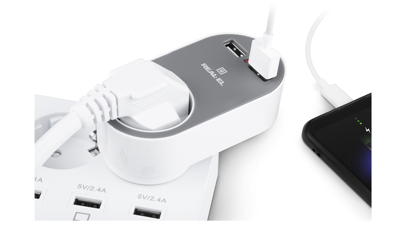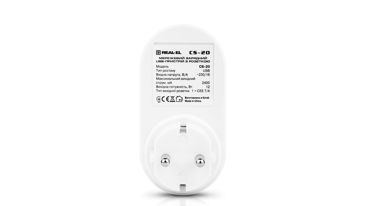Мережевий зарядний USB-пристрій з розеткою REAL-EL CS-20 призначено для заряджання акумуляторів портативних пристроїв (мобільних телефонів, смартфонів, MP3-плеєрів, КПК, планшетних комп’ютерів та інших цифрових пристроїв) та живлення портативної акустики від побутової електромережі.