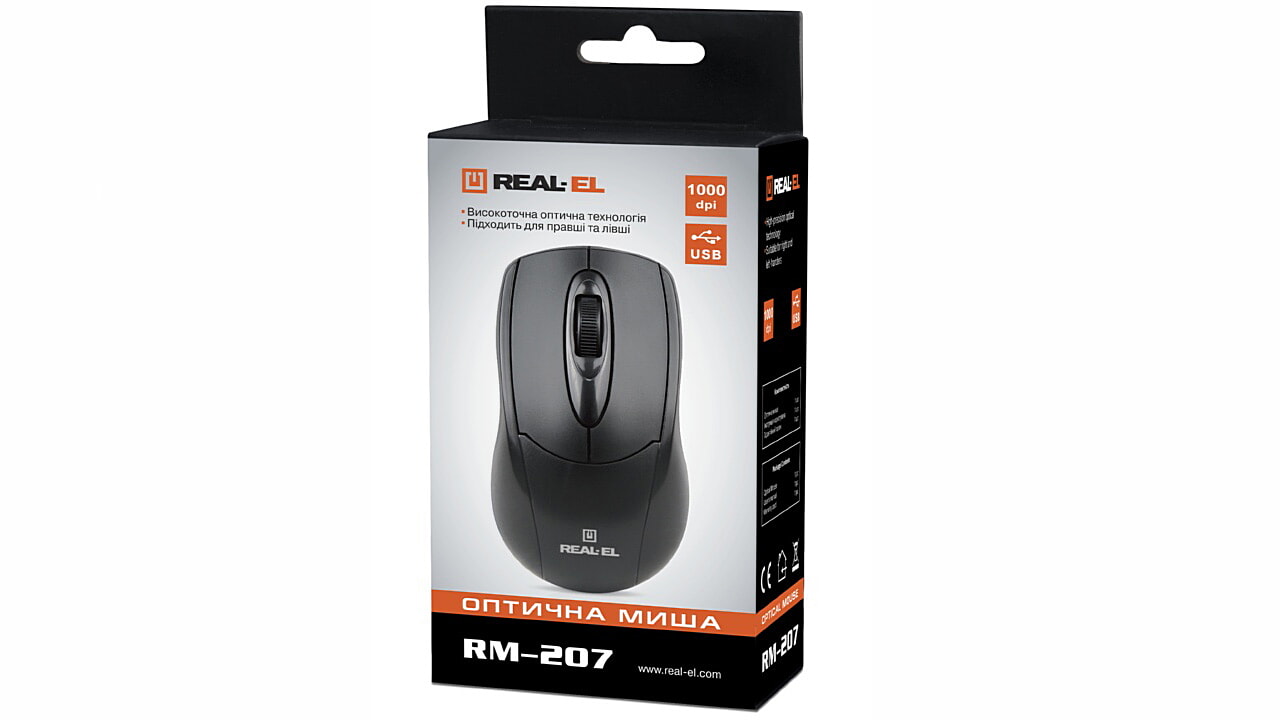Провідна миша REAL-EL RM-207 – ідеальне рішення для роботи і навчання. Високоточна оптична технологія надає маніпулятору RM-207 можливість працювати практично на будь-якій поверхні. Особливості: симетрична форма, 2 + 1 клавіші, колесо прокручування, зручна для правші та лівші.