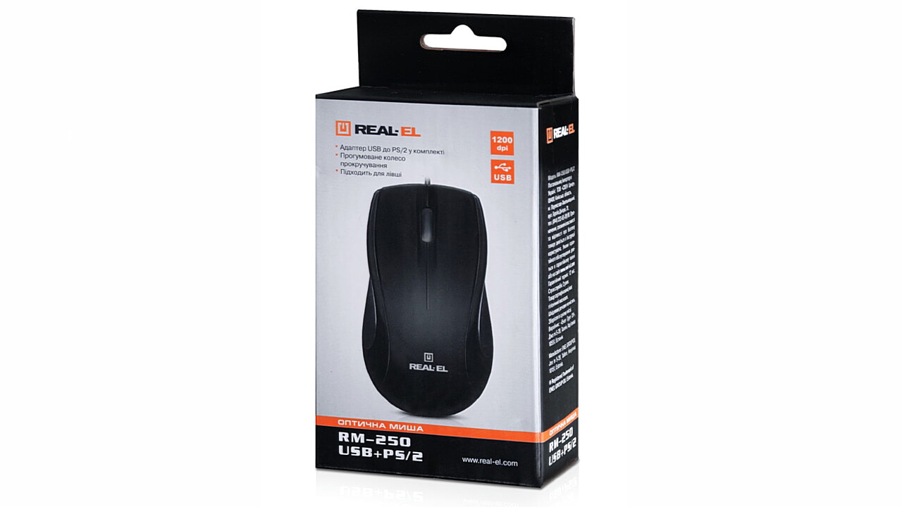 Високоточна оптична технологія дає змогу маніпулятору  REAL-EL RM-250 працювати практично на будь-якій поверхні. Особливості: 2 + 1 клавіші, колесо прокручування, інтерфейс USB та PS/2, природна форма маніпулятора зручна для руки.