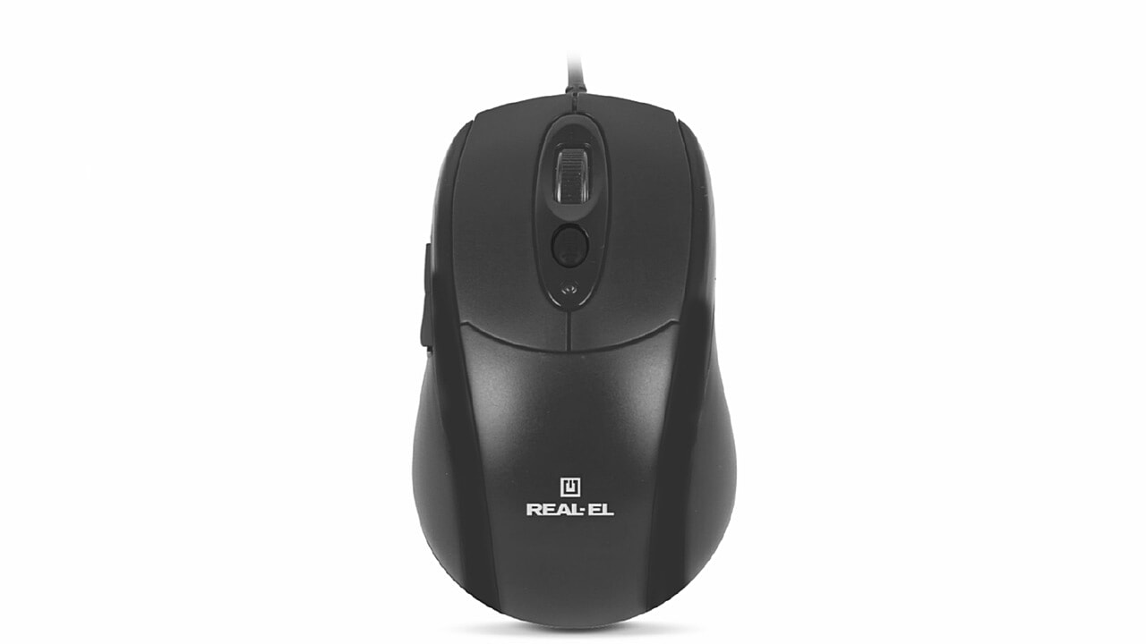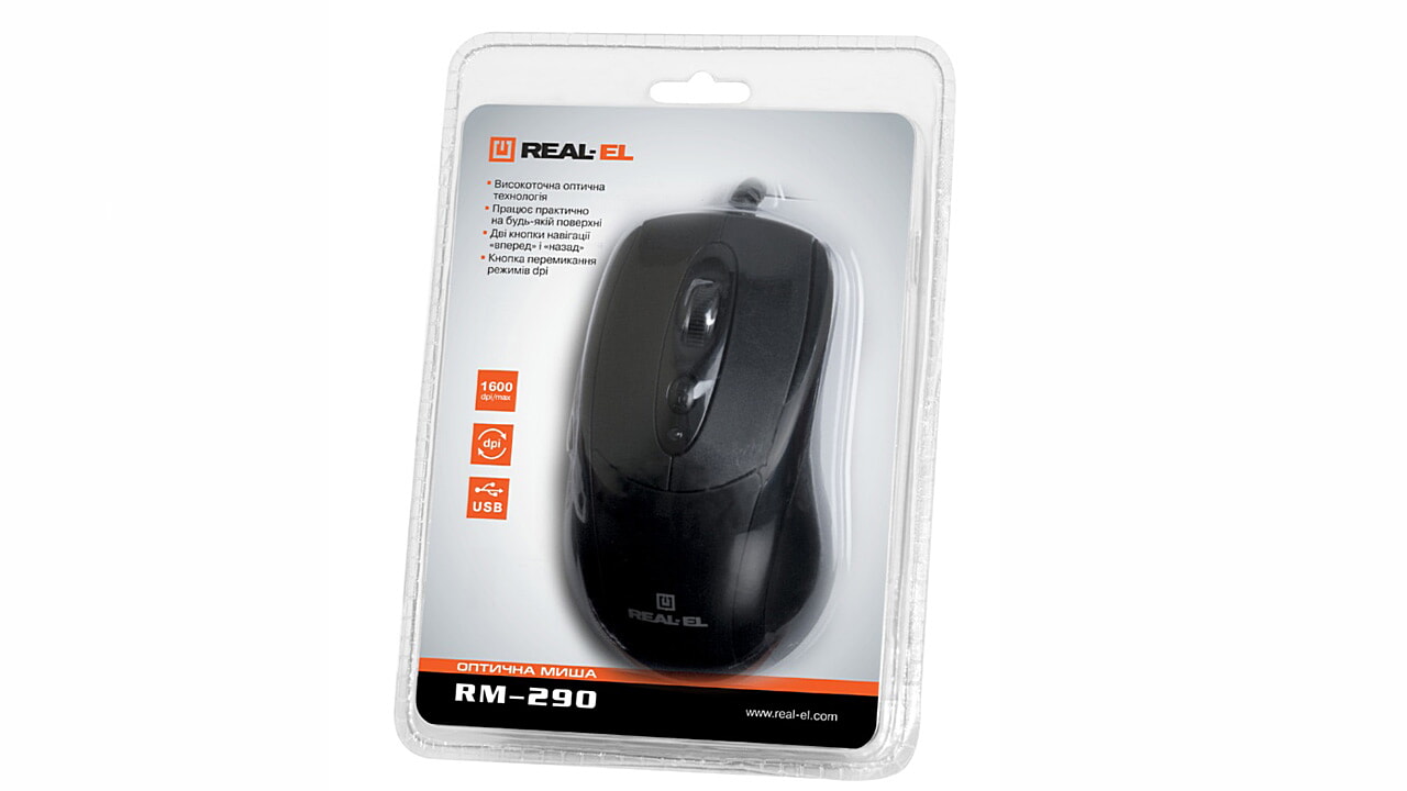 Особливості оптичної миші REAL-EL RM-290: 5 + 1 клавіші (колесо прокручування), 2 кнопки навігації «вперед»/«назад», кнопка перемикання режимів dpi, інтерфейс USB, працює практично на будь-якій поверхні, природна форма зручна для руки.