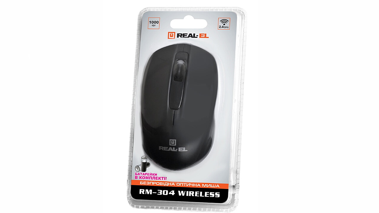 Енергоефективна безпровідна технологія дає змогу маніпулятору REAL-EL RM-304 Wireless працювати практично на будь-якій поверхні. Особливості: 2 + 1 клавіші, cтильний ергономічний дизайн, колесо прокручування, роздільна здатність – 1000 dpi, інтерфейс USB, збільшений термін роботи від батарейок.
