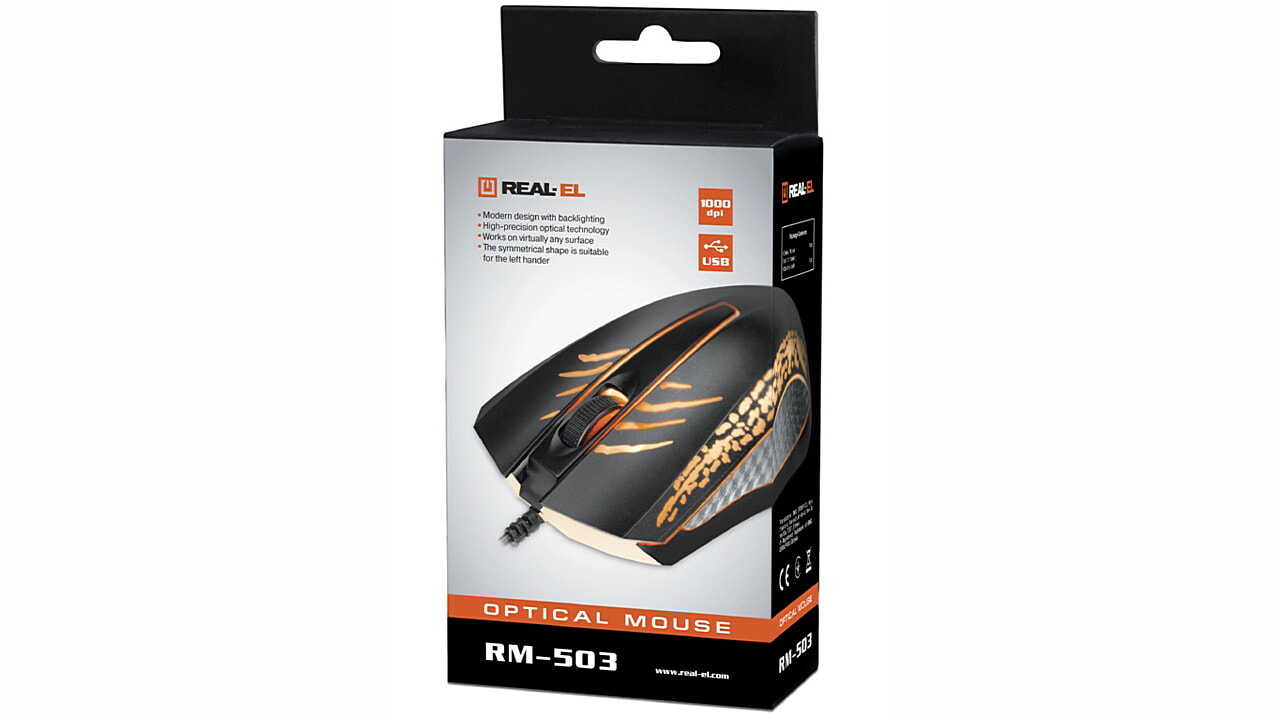 Високоточна оптична технологія надає змогу маніпулятору REAL-EL RM-503 працювати практично на будь-якій поверхні. Особливості: 2 + 1 клавіші, ергономічний дизайн, підсвічування, колесо прокручування, інтерфейс USB, природна форма маніпулятора зручна для руки.