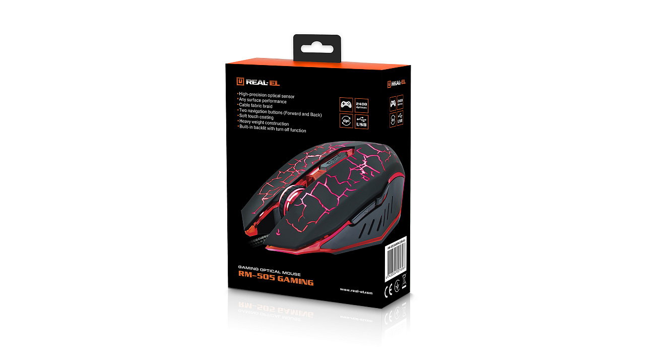 Високоточна оптична технологія дає змогу ігровій оптичній миші REAL-EL RM-505 Gaming працювати практично на будь-якій поверхні. Особливості: висока швидкість роботи, 5 + 1 клавіші, коліщатко прокручування, 2 кнопки навігації «вперед» і «назад», перемикач роздільної здатності, покриття корпусу Soft Touch, вмонтоване підсвічування з можливістю його вимикання.