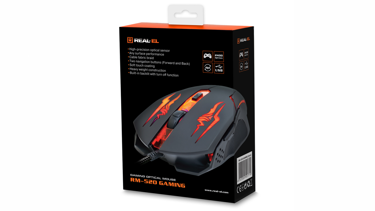 Високоточна оптична технологія дає змогу ігровій оптичній миші REAL-EL RM-520 Gaming працювати практично на будь-якій поверхні. Особливості: висока швидкість роботи, 5 + 1 клавіші, коліщатко прокручування, 2 кнопки навігації «вперед» і «назад», перемикач роздільної здатності, покриття корпусу Soft Touch, вмонтоване підсвічування з можливістю його вимикання.