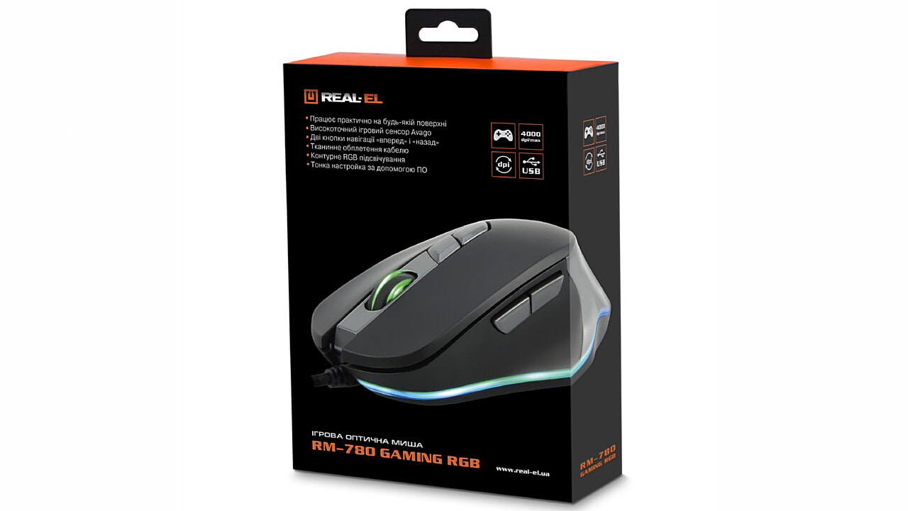 Високоточний ігровий сенсор Avago дає змогу ігровій оптичній миші REAL-EL RM-780 Gaming працювати практично на будь-якій поверхні. Головні особливості: висока швидкість роботи, 6 + 1 клавіші, максимальна роздільна здатність миші – 4000 dpi, тканинне обплетення кабелю, контурне RGB підсвічування, тонка настройка за допомогою ПО.