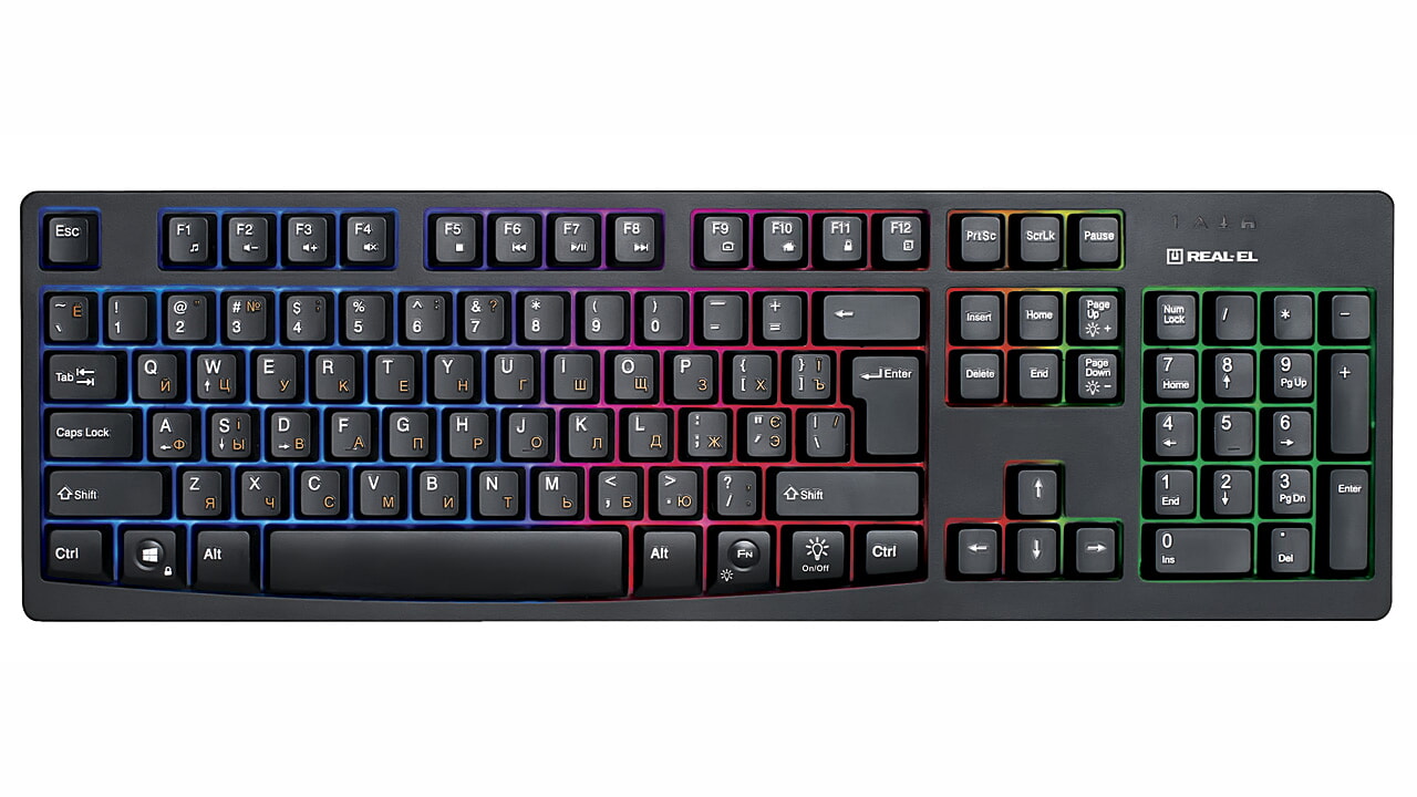 Особливістю мультимедійної клавіатури з підсвічуванням REAL-EL Comfort 7000 Backlit є багатокольорове підсвічування клавіш, функція Winlock із спеціальним світловим індикатором, 19 клавіш, що не конфліктують між собoю, можливість використання в іграх, комфортний м'який хід клавіш.