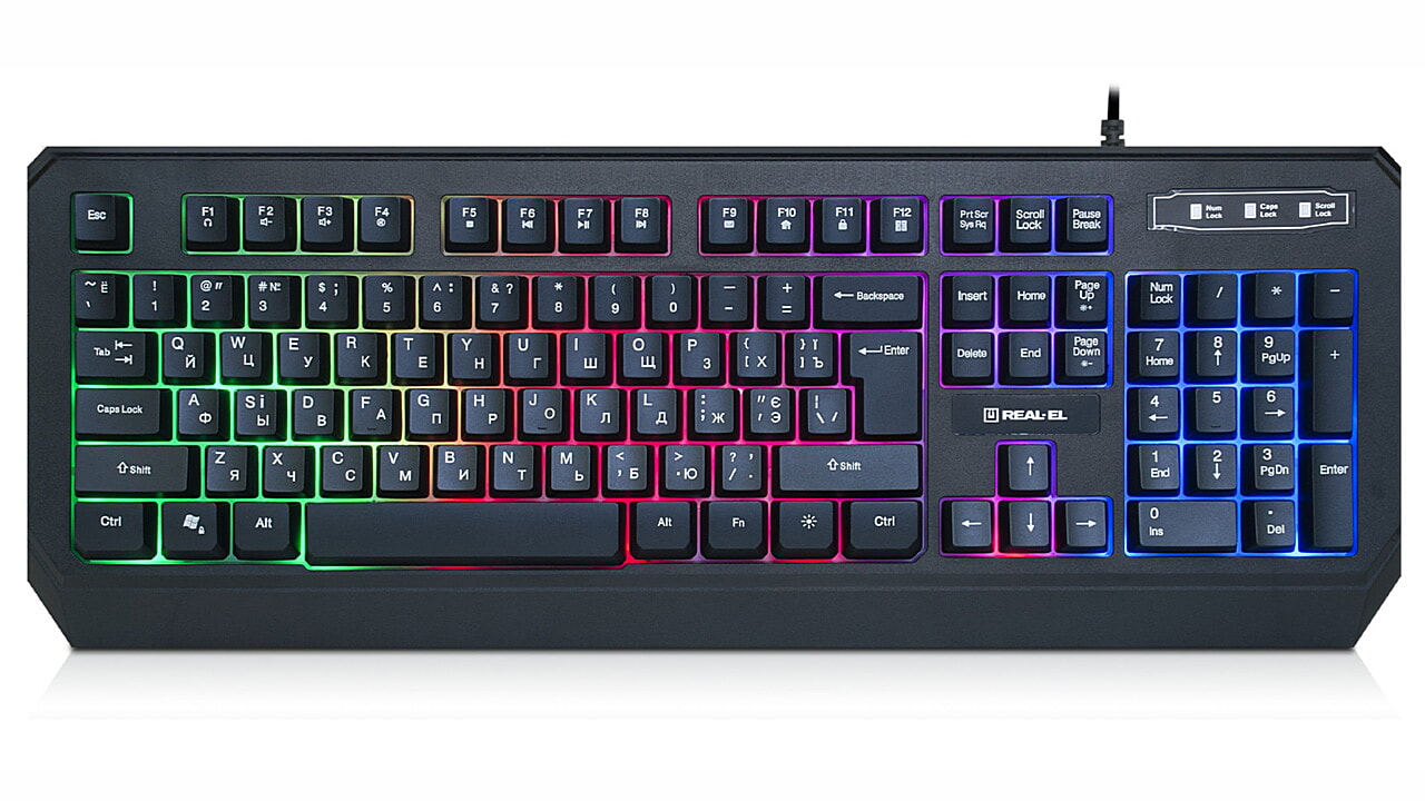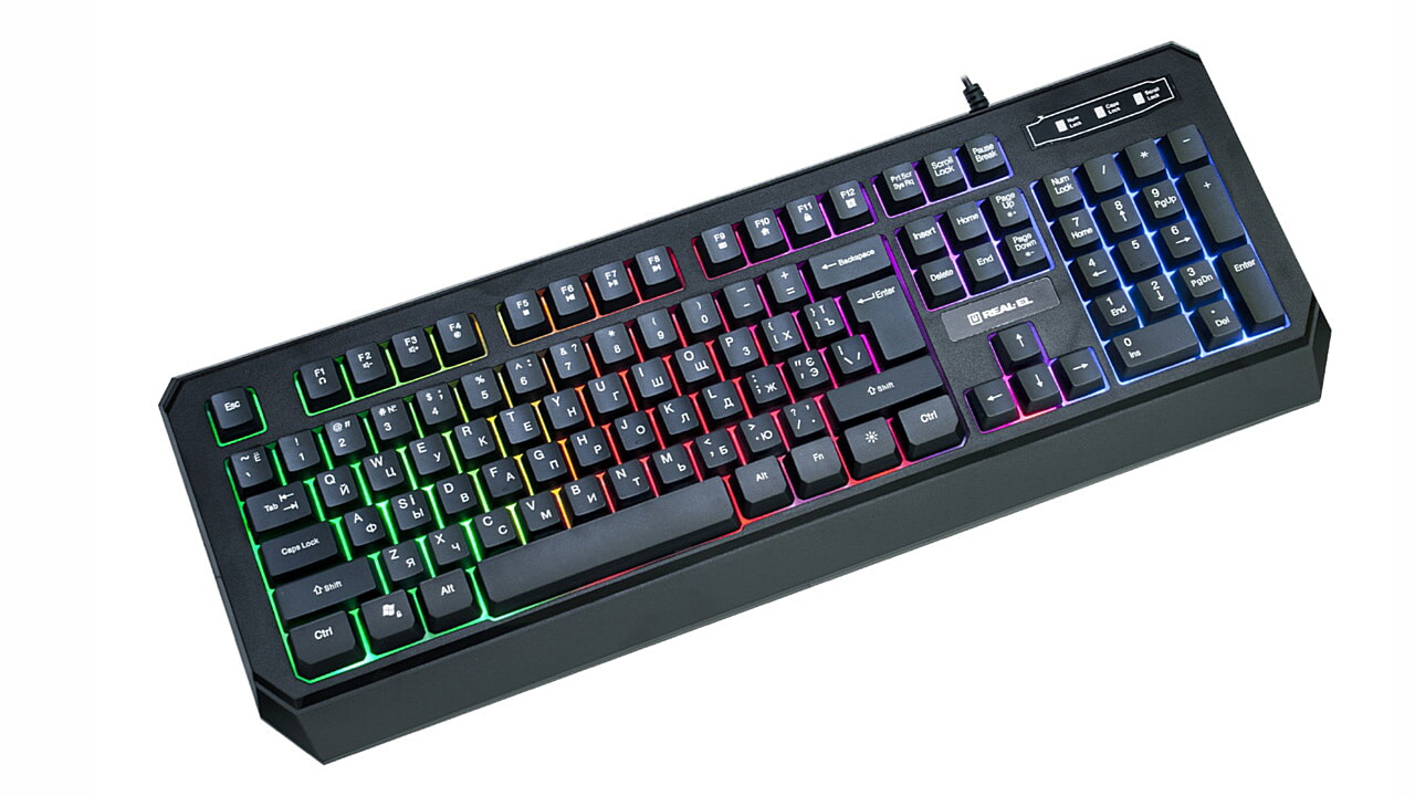 Особливістю мультимедійної клавіатури з підсвічуванням REAL-EL Comfort 7001 Backlit є багатокольорове підсвічування клавіш, функція Winlock із спеціальним світловим індикатором, можливість використання в іграх, комфортний м'який хід клавіш.
